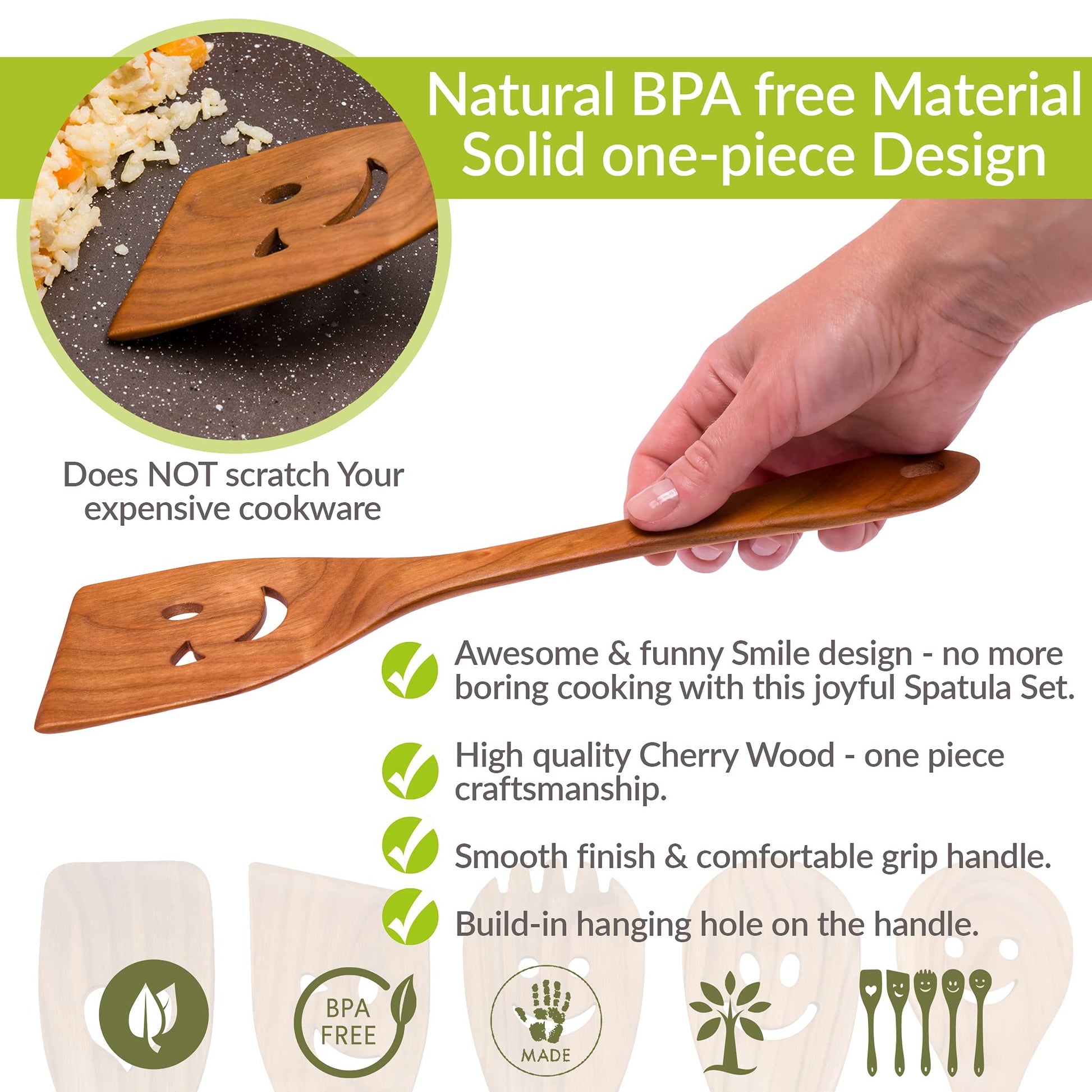 MFC 5-Piece Wooden Cooking Spoons - Kitchen Spatula Set from Natural Cherry Wood - Wooden Spoons for Cooking - Funny Utensil Set with Smiley Faces - Cooking Multipurpose Wood Utensils