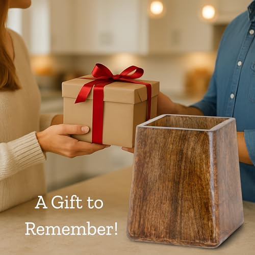 - AESTHETIC UTENSIL HOLDER: This Modern Utensil Holder is handmade from 100% Eco-Friendly Mango Wood that is sturdy and heavy, which makes it less prone to topple. Further, the square taper cylindrical shape makes it look more stylish and beautiful.