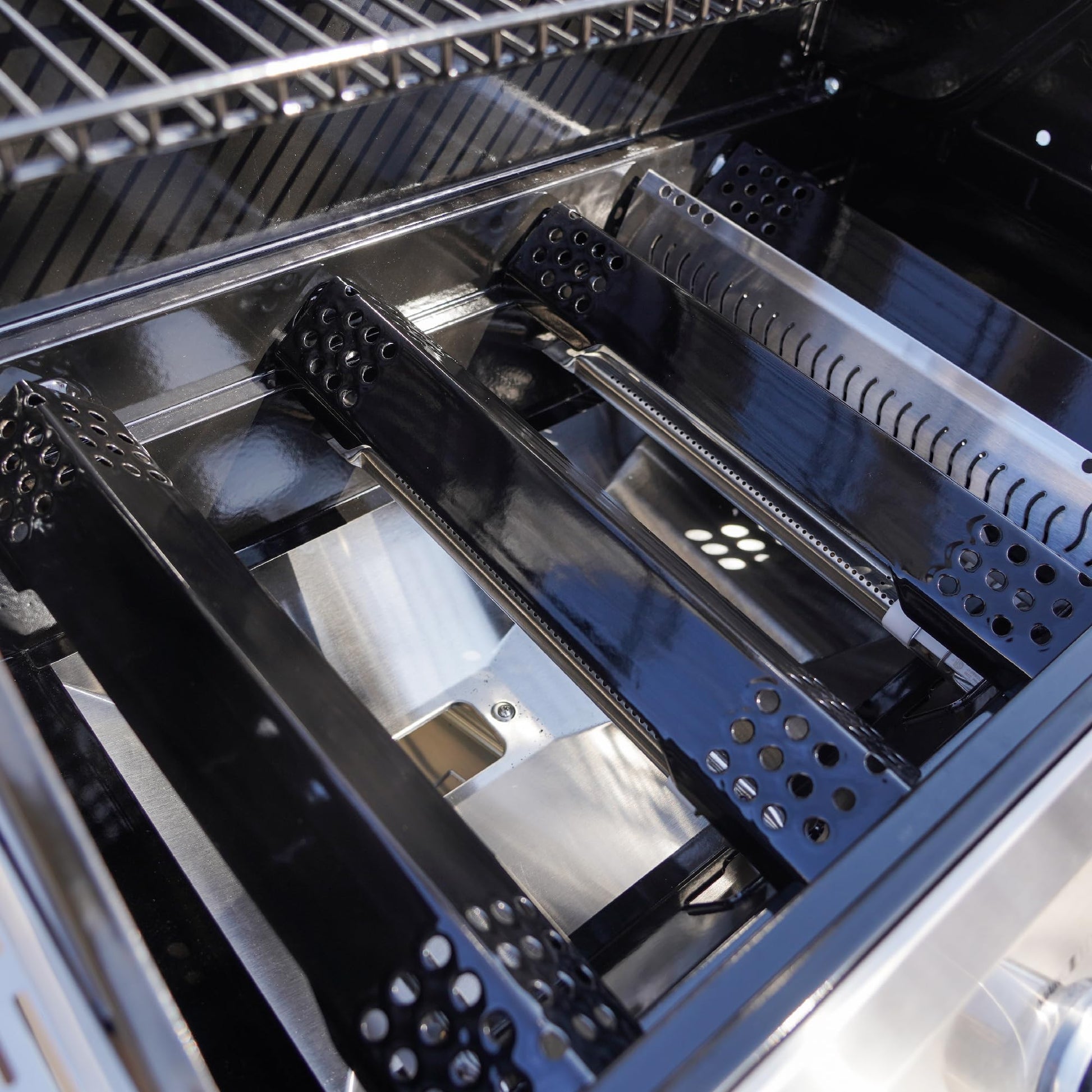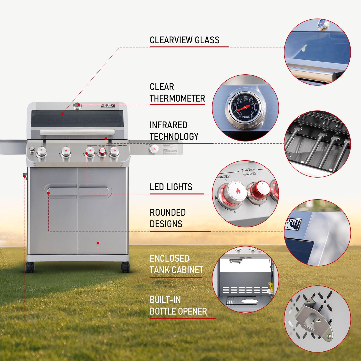 - STAINLESS STEEL BURNERS: Four primary burners, accompanied by one side burner, collectively generating 62,000 BTU, ensure robust heat and an exceptional grilling experience.