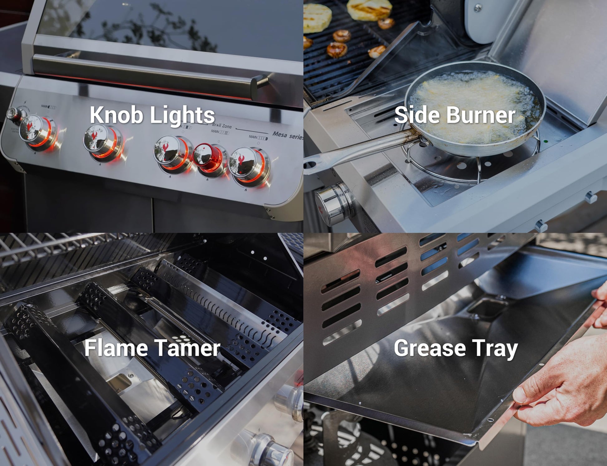 - HANDY TOOLS: The New Mesa series features convenient hooks for keeping your grilling essentials nearby. Plus, the built-in bottle opener is always ready to help when it's time to crack open a cold one.