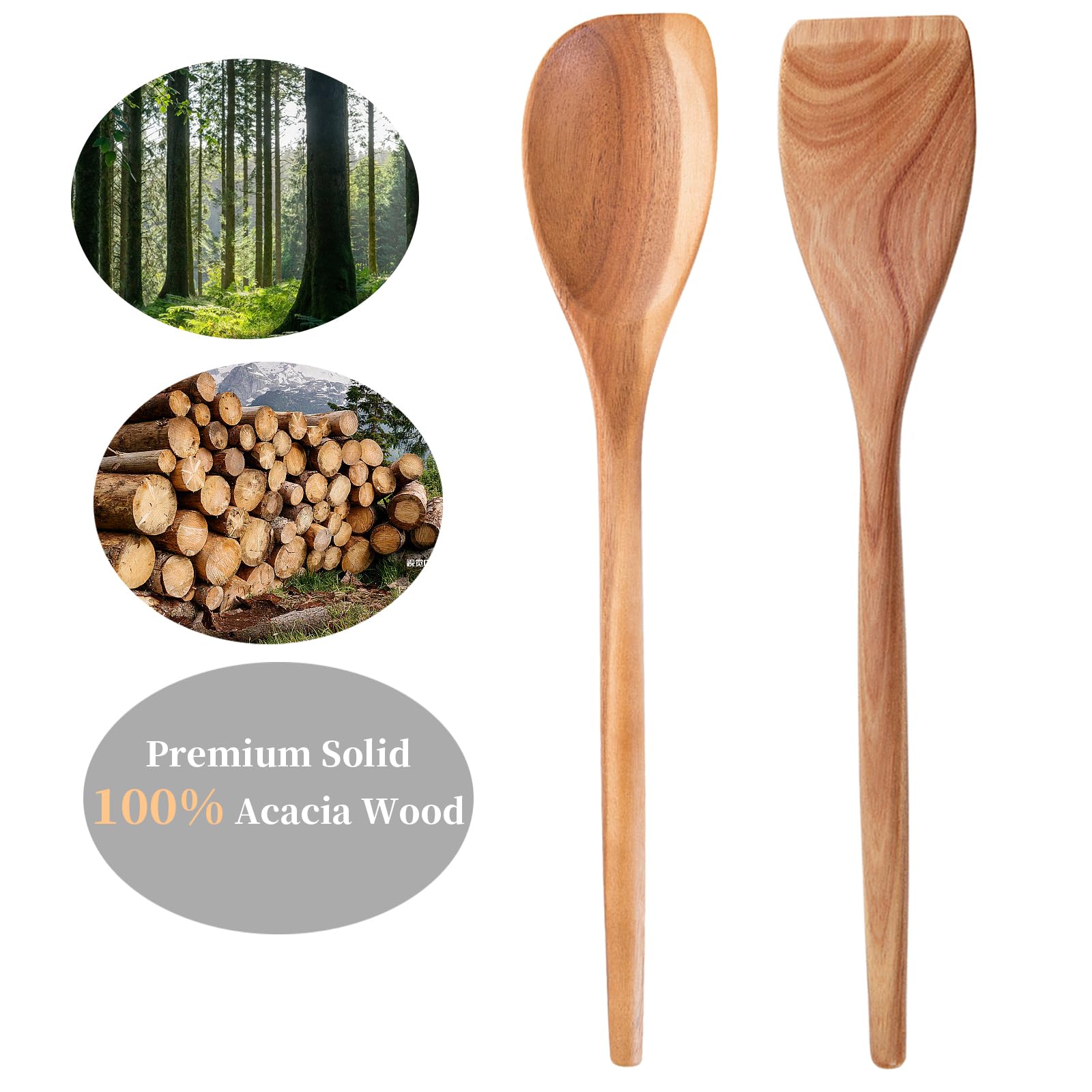 MornHalo 2PCS Acacia Wooden Spoons For Cooking-14 Inch Smooth Finish Cooking Spoons-Comfortable Grip Wood Spoons for Cooking - Non-Stick Cooking Utensils (Corner spoon + Cooking Spatula)