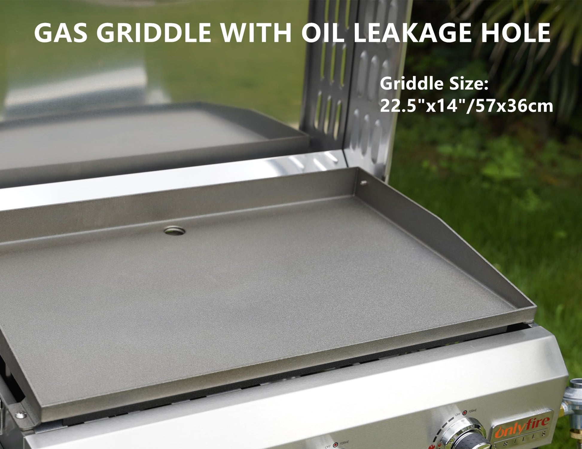 - PREMIUM HEAVY DUTY STAINLESS STEEL CONSTRUCTION: The Onlyfire portable gas grill is made of high quality stainless steel to ensure duarability and longlife use. The large iron flat top griddle allows you to enjoy delicious food easily. Perfect for camping, tailgating, picnics, RV trip and backyard BBQ gathering.