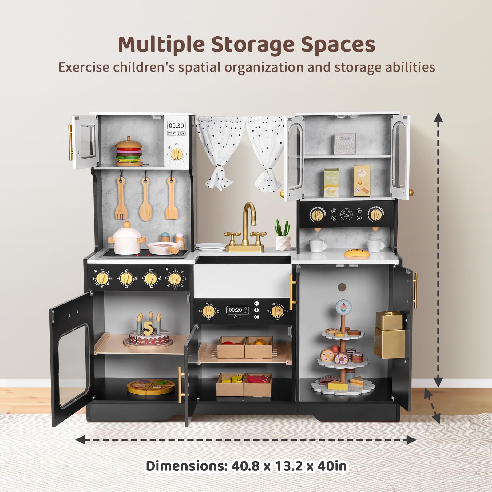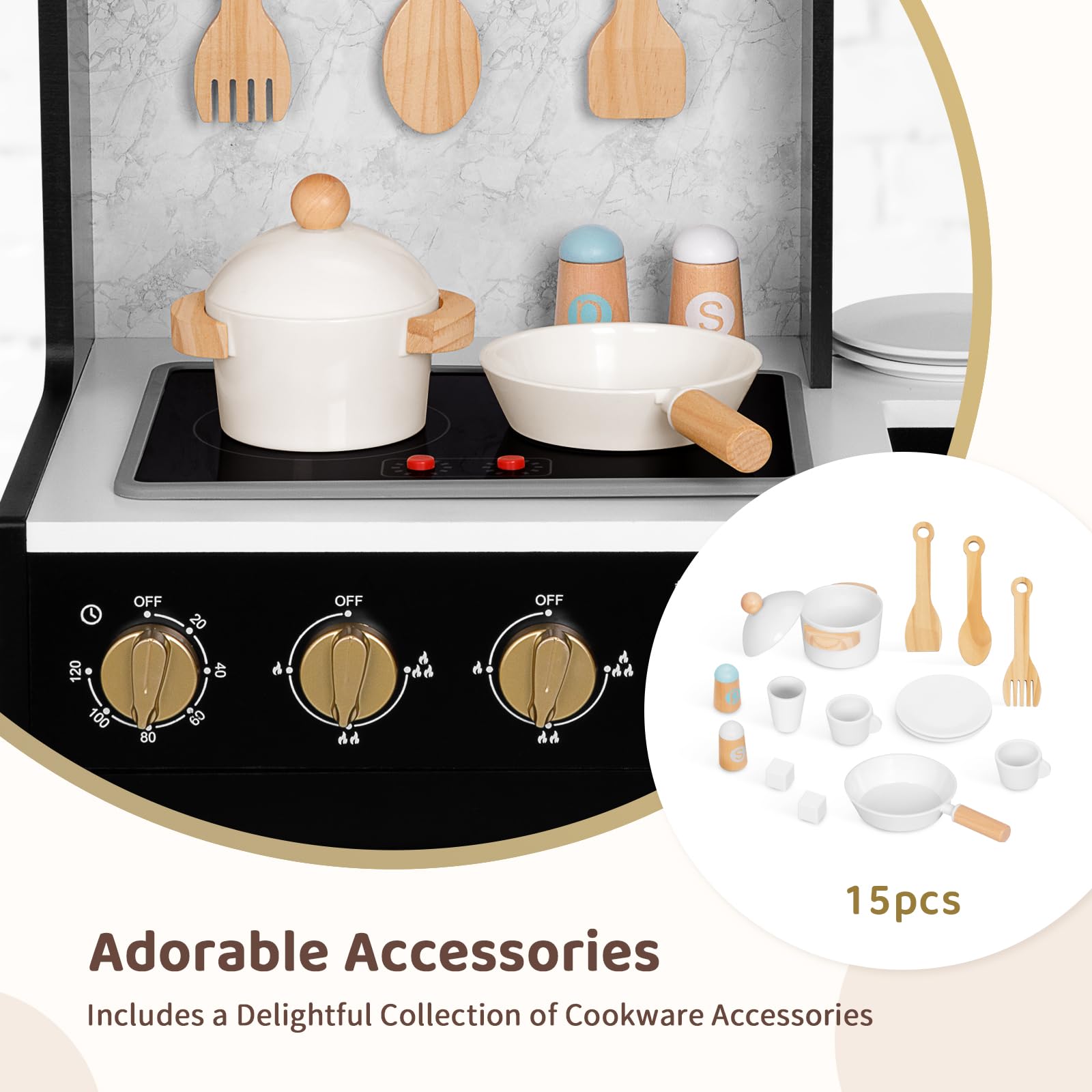 OOOK Modern Wooden Play Kitchen Set for Kids, Toddler Kitchen Playset with Real Lights & Sounds, Including 14 Pcs Accessories, Gift for Girls and Boys