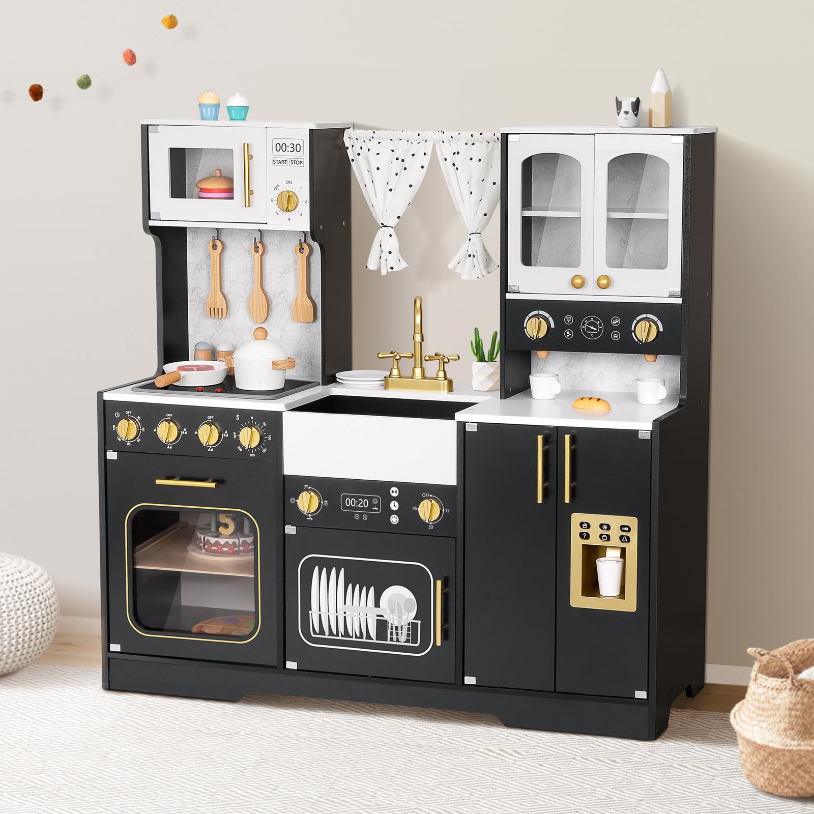 - Realistic Toy Kitchen: Wooden play kitchen aims to mimic real-life activities. The stove has realistic lighting and sound. Turning the knob can make a fun clicking sound, and the ice maker can also dispense ice cubes! Let your child unleash their imagination in their own game kitchen