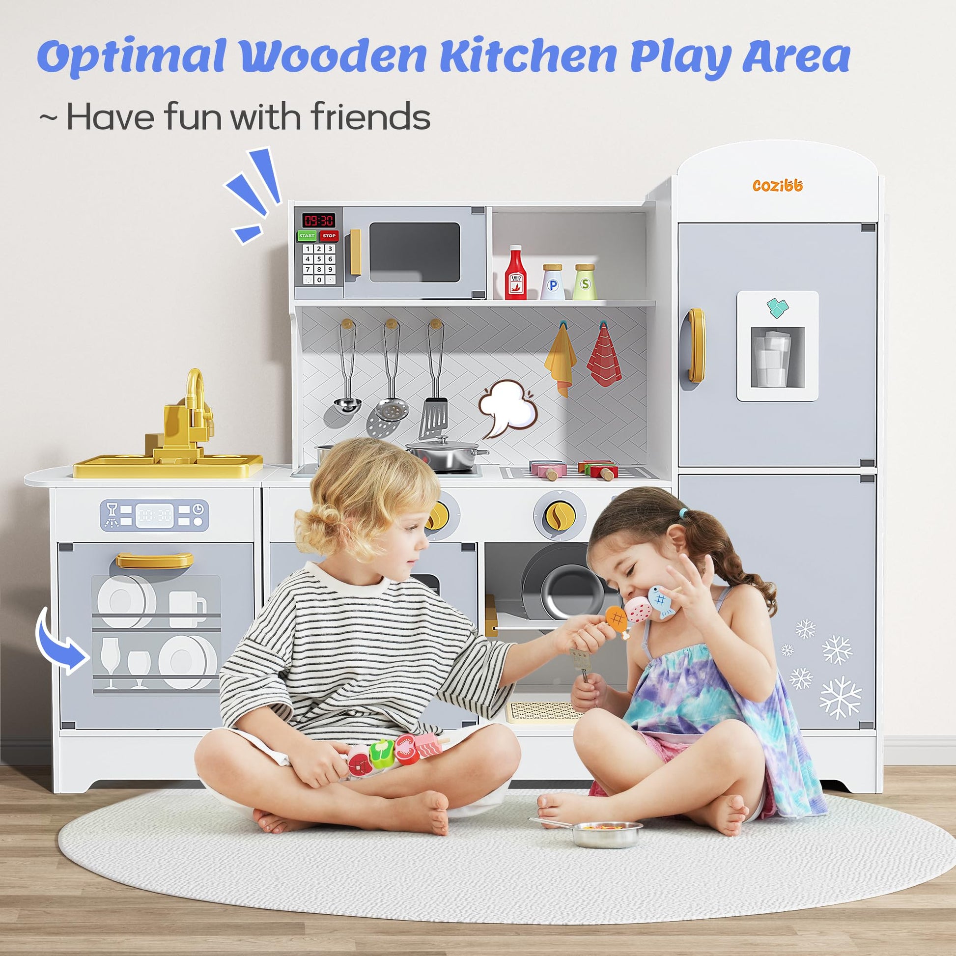 - Realistic Kitchen Set: Tailored for children aged 3-8. This toddler kitchen playset is designed to mimic real-life activities. A compressible ice maker (with ice), a stove with corresponding sound and light effects, a simulated microwave oven with real heat (with real sound and light), a real faucet to run water, a barbecue with two skewers; It allows children to explore different culinary delights while stimulating their imagination and creativity