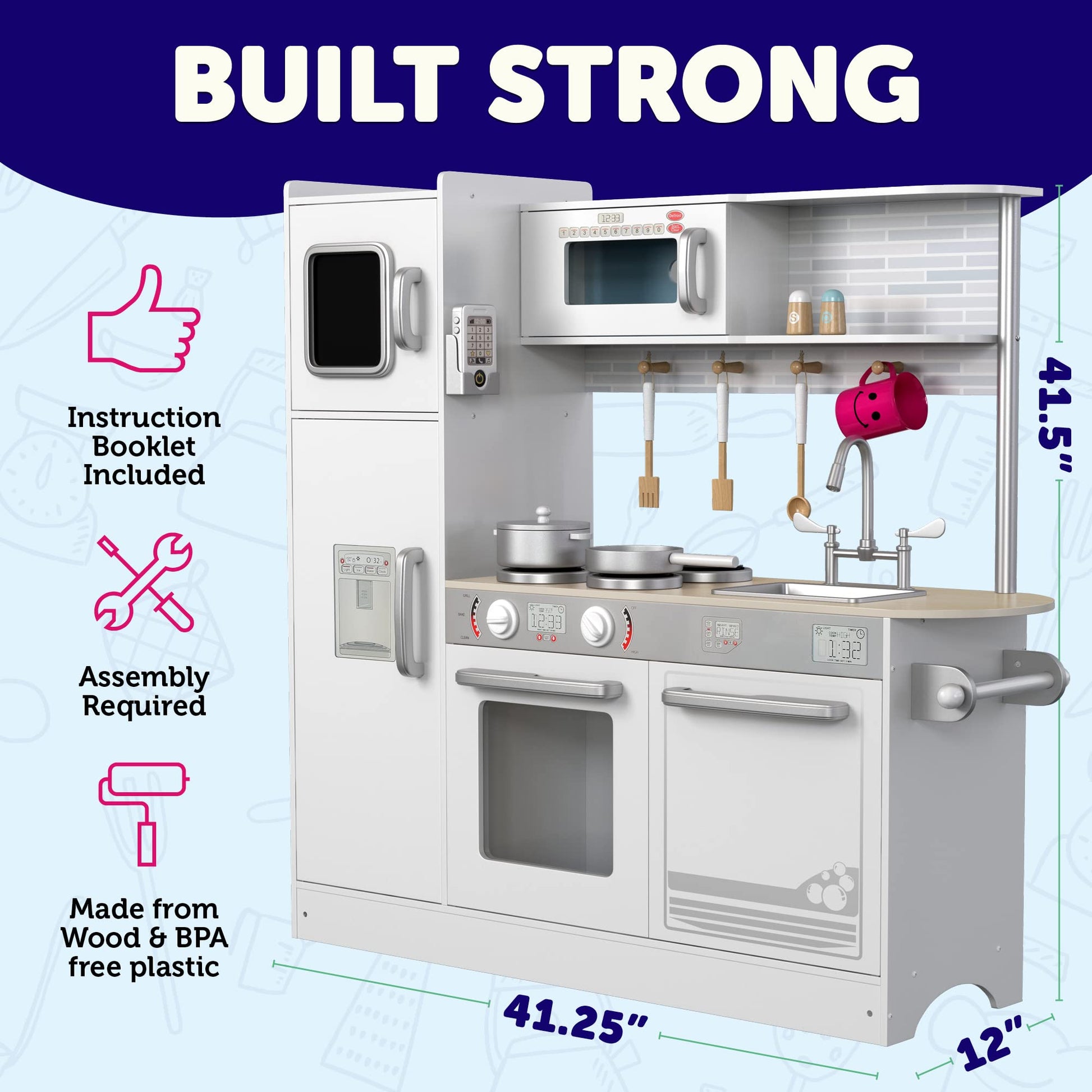 Play Kitchen - Wooden Kitchen Playset for Toddlers and Big Kids - Large Pretend Toy playset for Boys and Girls with Cooking Stove, Oven, Pots, Pans, Phone, Microwave, Fridge, Sink, Utensils - Ages 3-8
