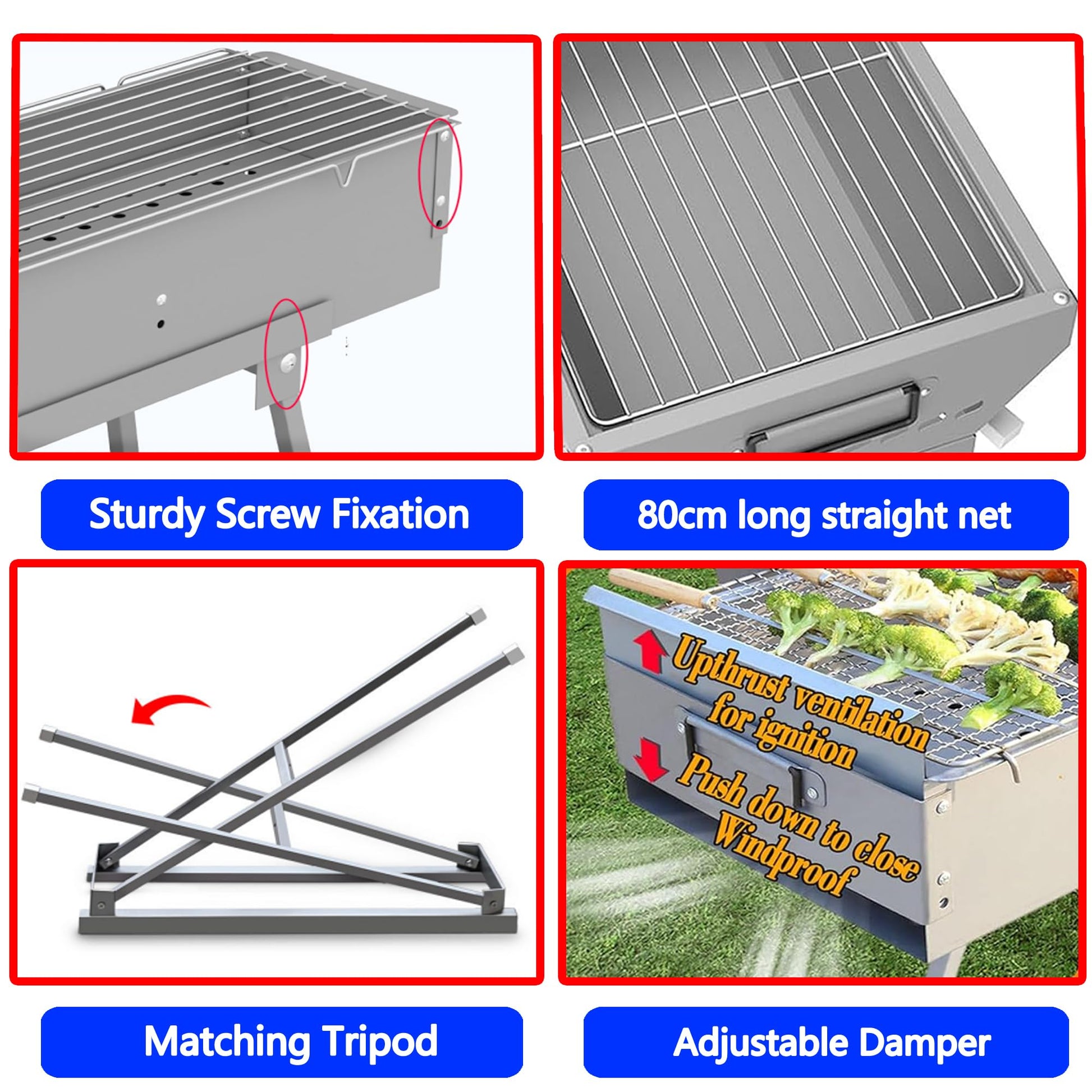 Portable Charcoal Grill, Stainless Steel BBQ Grill with Foldable Stand Adjustable Air Vents, Kebab Skewer BBQ Barbecue Grill Kit for Garden Backyard Party Picnic Travel Outdoor Use (31.6x7.1inch)