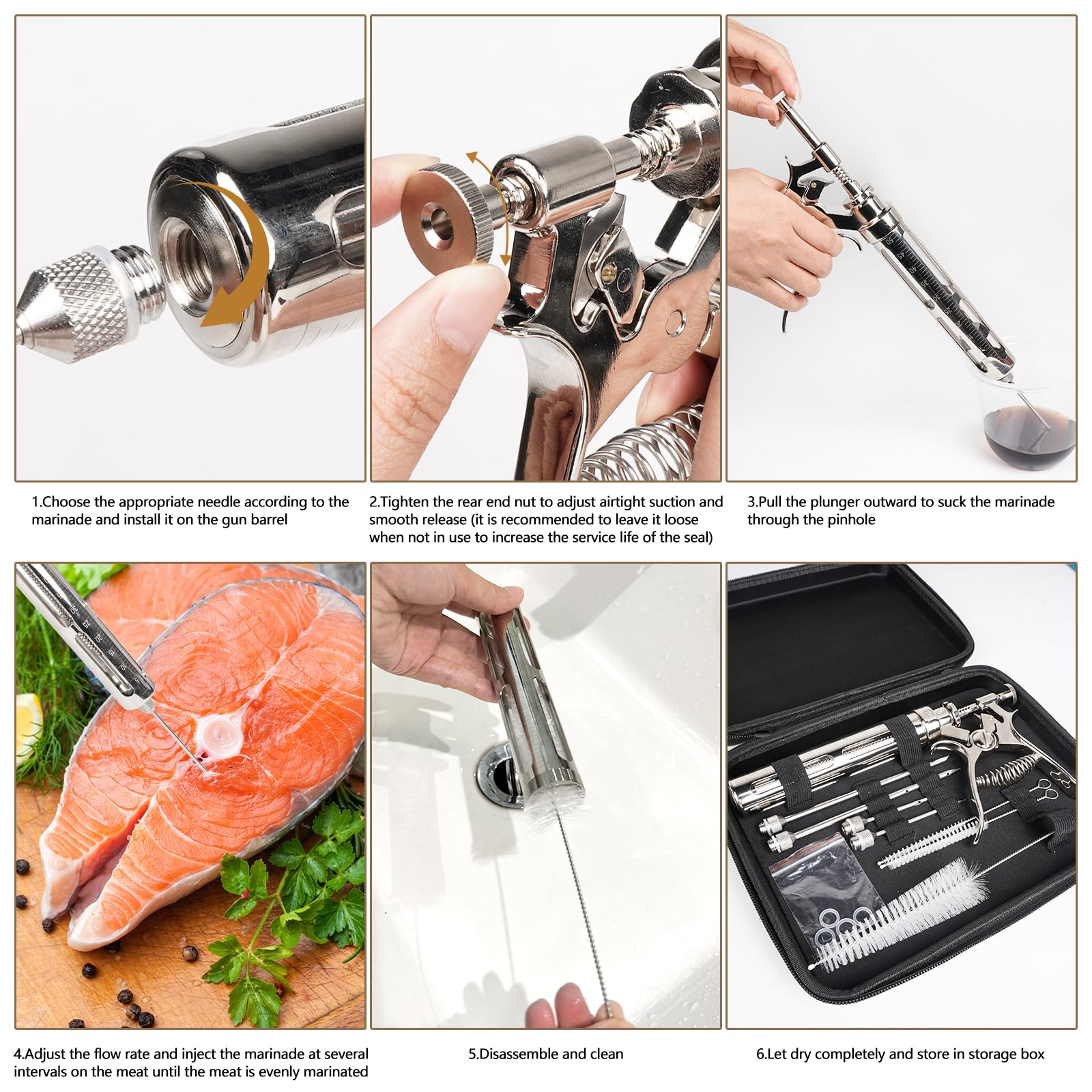 Crafted from high-quality, thickened food-grade stainless steel, our injector prevents clogs and jams, delivering a seamless injection process. The user-friendly design ensures quick assembly and disassembly, making it a breeze for both novice cooks and seasoned grill masters.