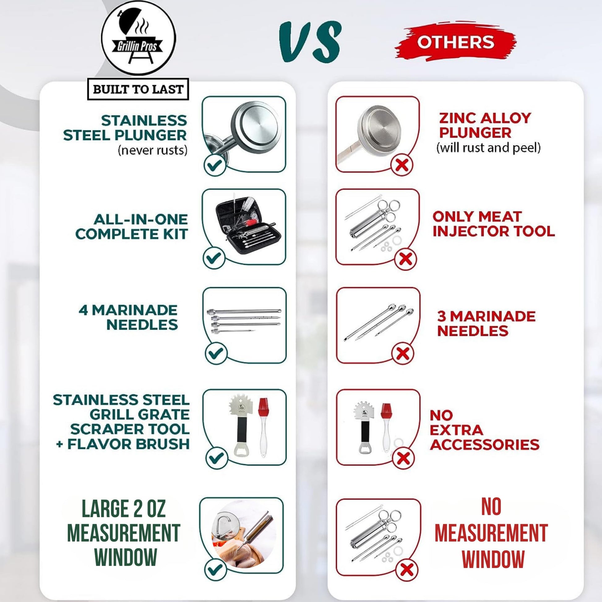 - UNBREAKABLE STAINLESS STEEL - Our meat injectors for smoking and grilling are unlike any tool on the market. We’ve built our products with the highest grade 304-stainless steel, corrosion-resistant, and easy to clean. Deliver flavor deep beyond the upper surface; Say goodbye to dry, boring cuts and take your bbq, turkey and brisket injection game to the next level; For people who care about mouthwatering meat, Grillin Pros meat injector syringe kit is the obvious solution.