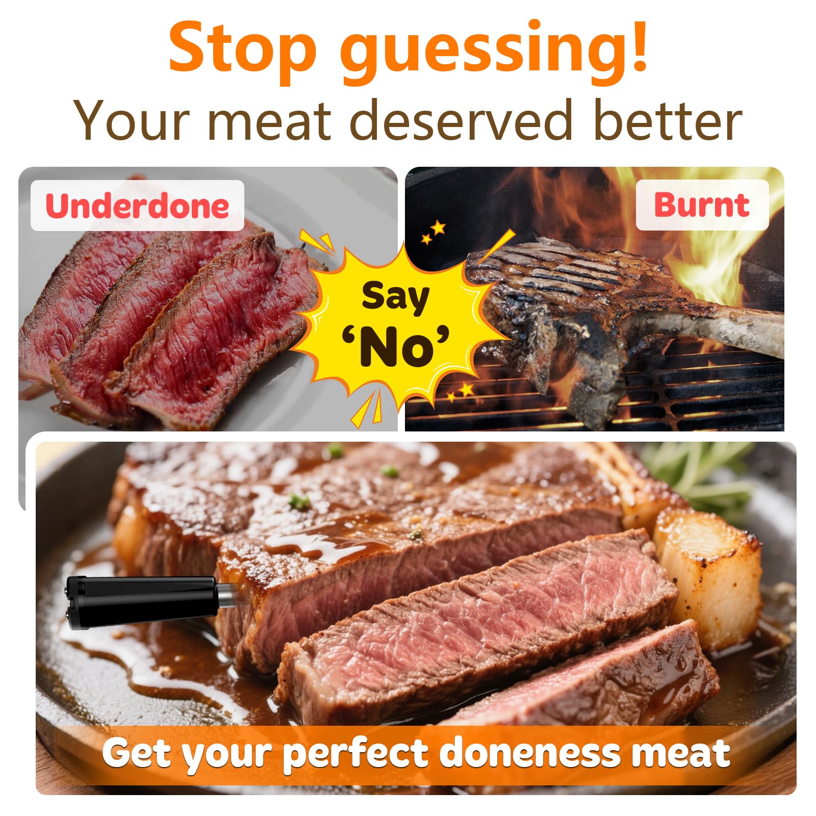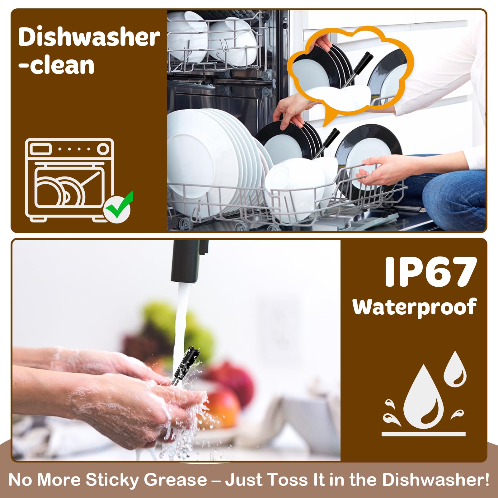 - High-Heat Probes: The stainless steel probe of digital meat thermometer is built to withstand extreme temperatures up to 300°C (1000°F), making it perfect for high-heat grilling, smoking, and outdoor cooking. It can monitor internal temperatures up to 100°C (212°F) with ±1°C (±1.8°F) accuracy. The IP67 waterproof design ensures easy cleaning, even under running water or in the dishwasher