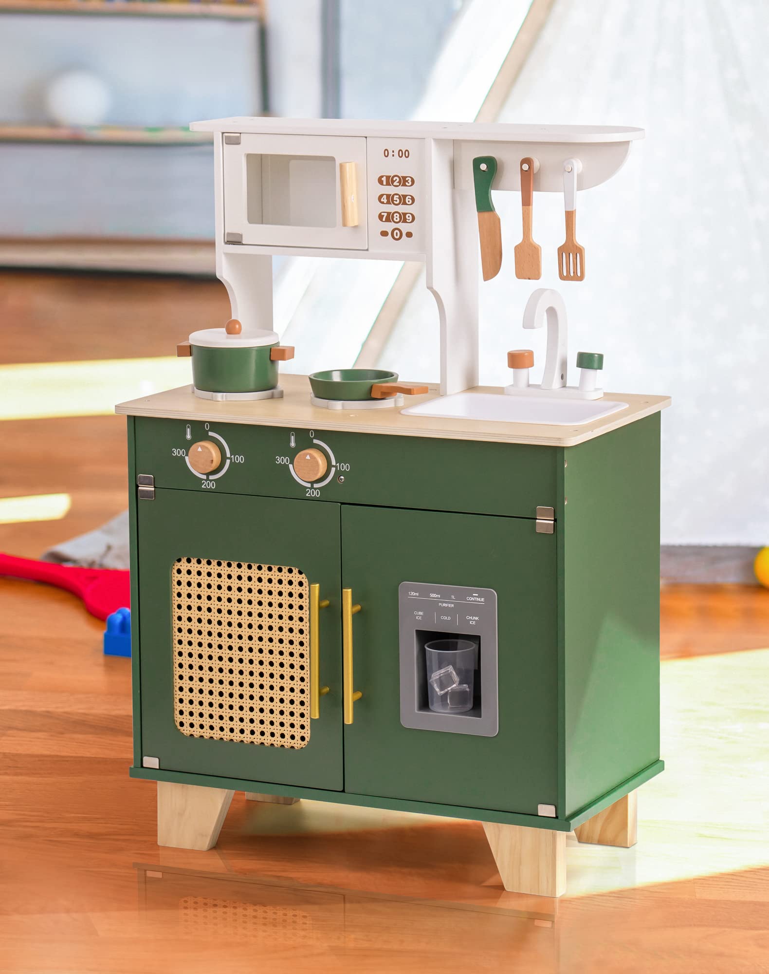 ROBOTIME Play Kitchen with Pretend Ice Cube Dispenser for Toddler, Wooden Kids Kitchen Play Set, Toy Kitchen Set for Kids Age 3 4 5 6 7 (Vintage Green)