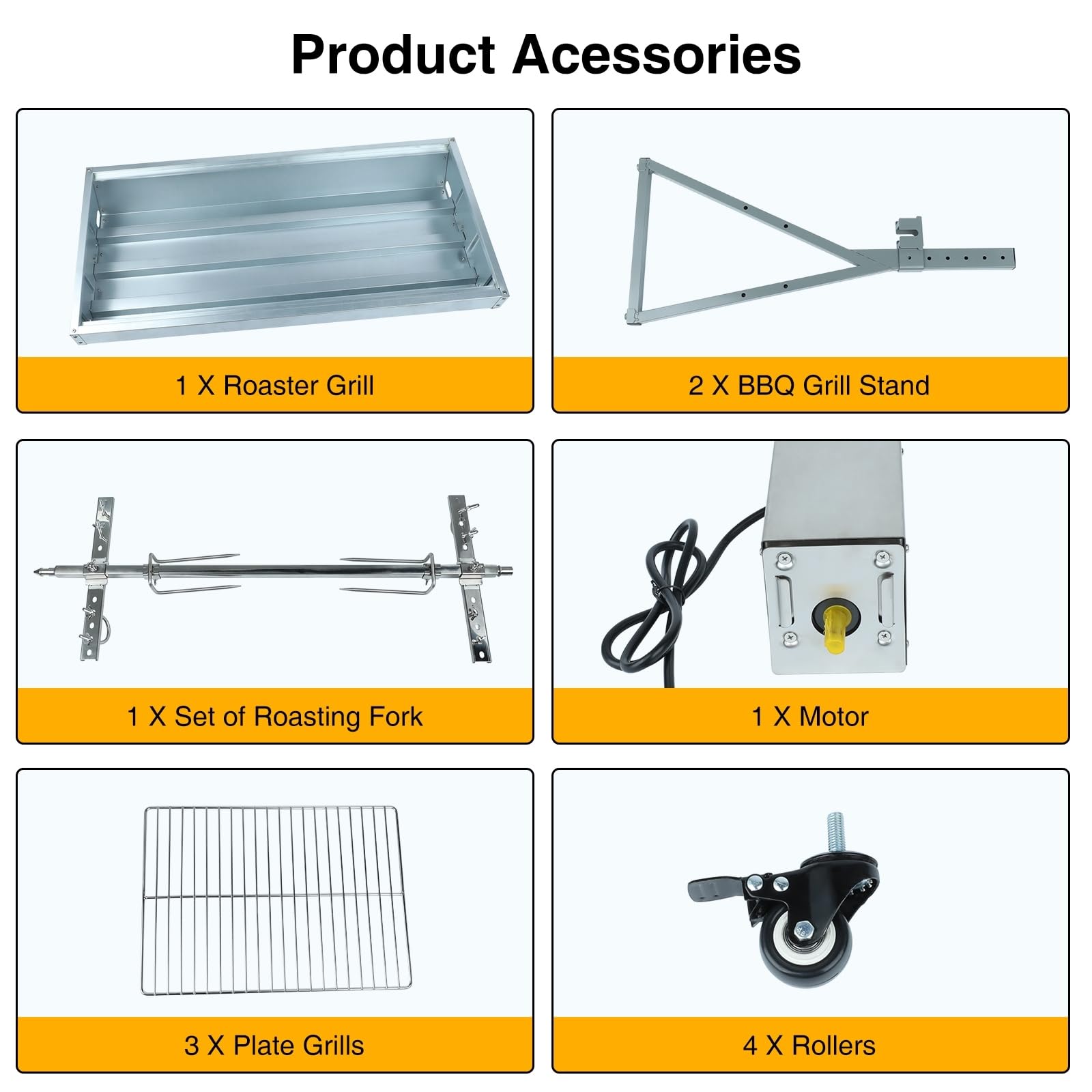 - LARGE GRILL SURFACE & STAINLESS STEEL - This roaster maximum load is 132lbs, the large grilling surface is 38.5"* 18.1", roasting 2-3 turkeys at a time and the heavy-duty 41" spitting rod can fix the whole goat for roasting, spitting rod load is 88lbs. The grill is made of high-quality stainless steel structure, strong and durable, high temperature resistant, easy to maintain and clean. Type: 2 in 1 BBQ Rotisserie Grill. Motor Power: 25W. Motor Speed: 7RPM