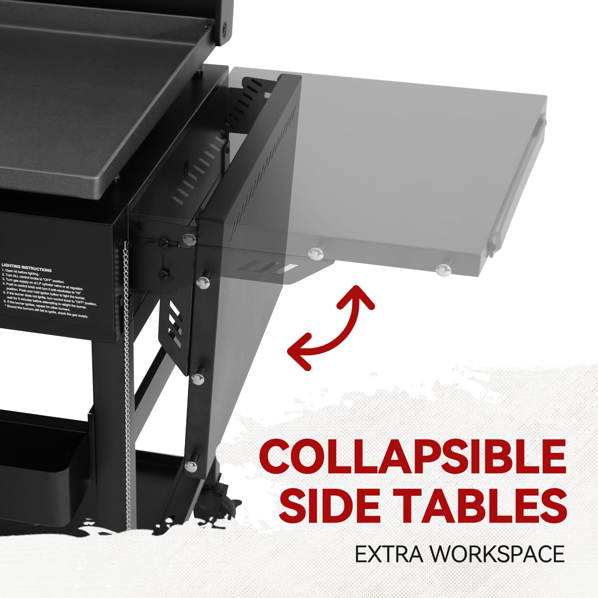- Collapsible Side Shelves: Foldable side tables with hooks for hanging tools, and the right-side table with knife strip frees up your hands, both providing a convenience storage solution.