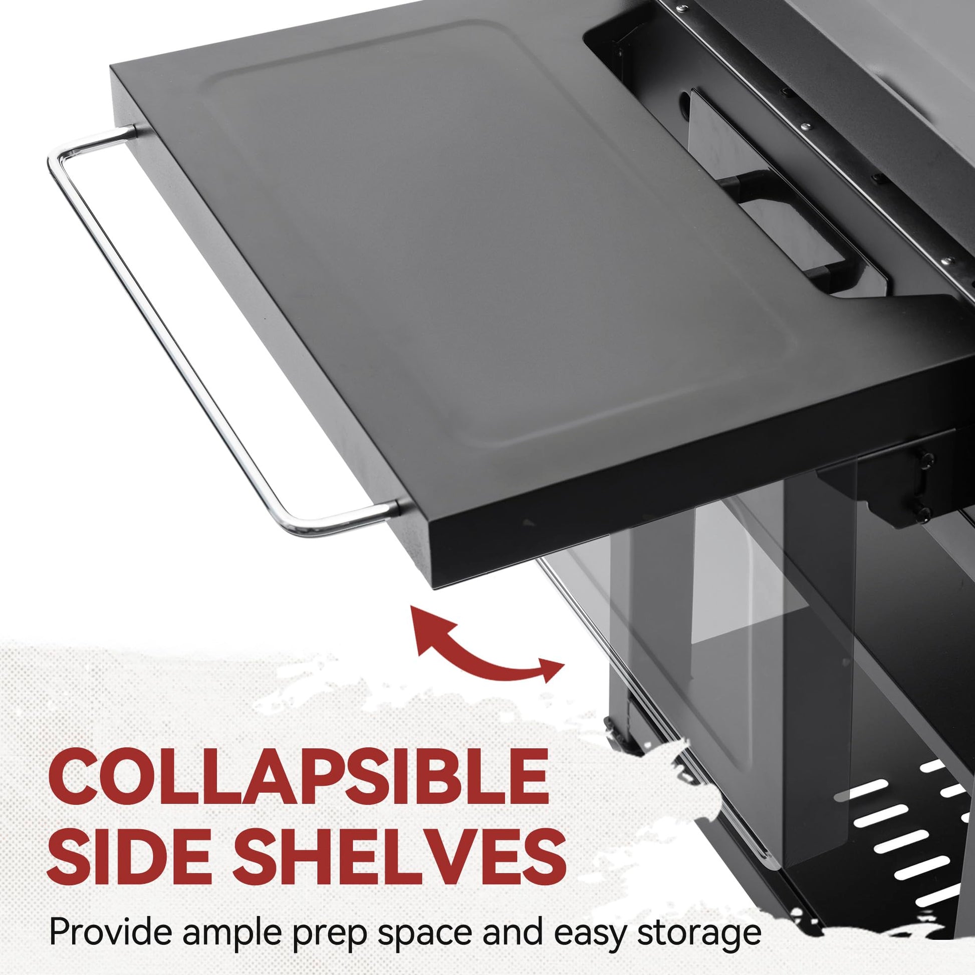 - Versatile Side Tables: Two side tables, equipped with a towel rack, a knife holder and tool hooks, keep cooking essentials handy and offer ample prep space to place seasonings, tools and plates. In addition, it can be folded down for better storage