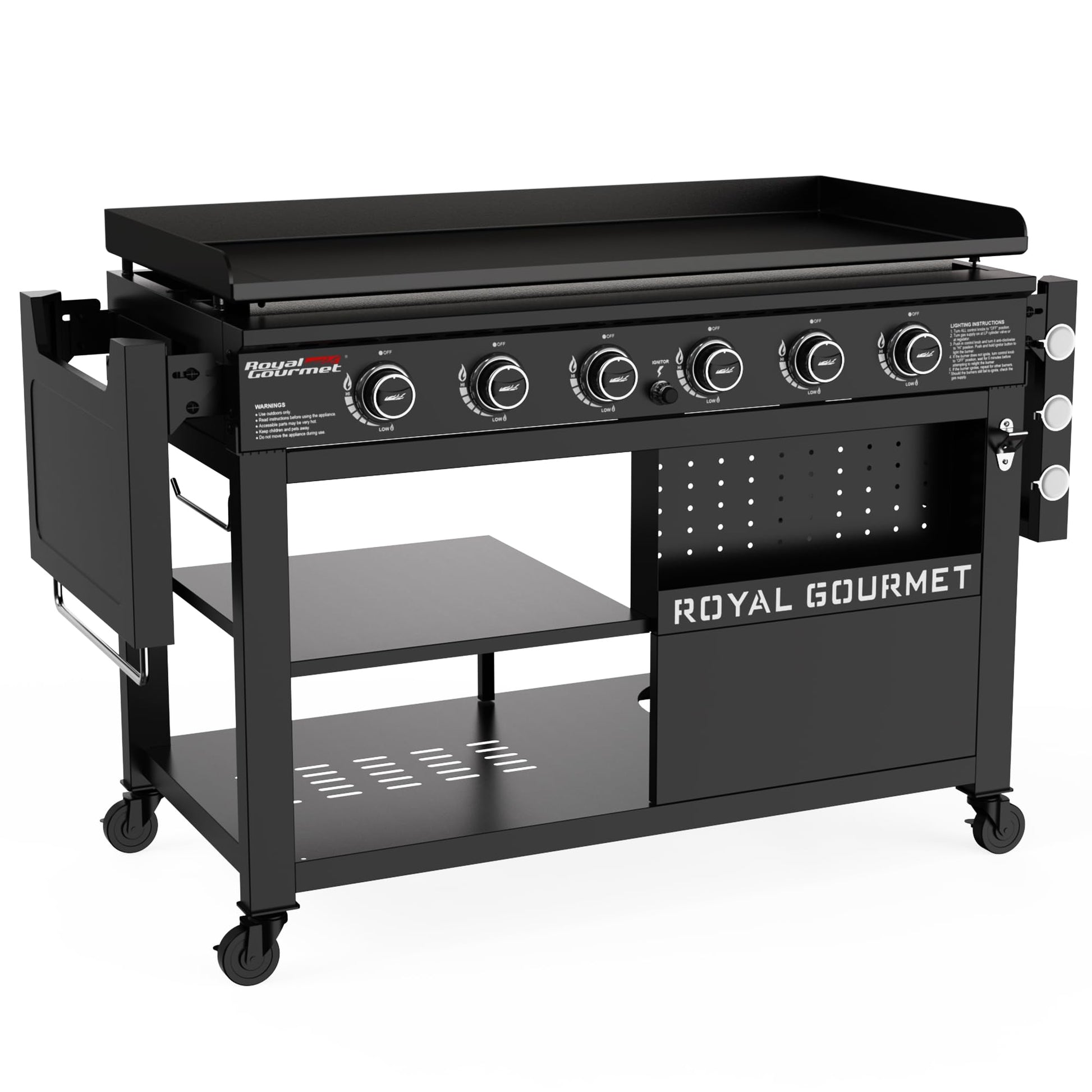 Details: Royal Gourmet is constantly refining its products, dedicated to providing customers with a top-notch cooking experience. We are now rolling out our new upgraded griddle - Royal Gourmet GB6000 44-Inch 6 Burner Flat Top Gas Griddle, which combines a decent look, high performance, unparalleled convenience and the joy of cooking. It stands out with its multiple extraordinary features: extra large cooking space (994 sq.in.), super high cooking power (78,000 BTU in total), plenty of independently controlled burners, a series of thoughtful designs for prep and storage, etc. Whether you want to host a big memorable BBQ cookout, or a small family gathering, the Royal Gourmet GB6000 gas griddle is a smart buy!