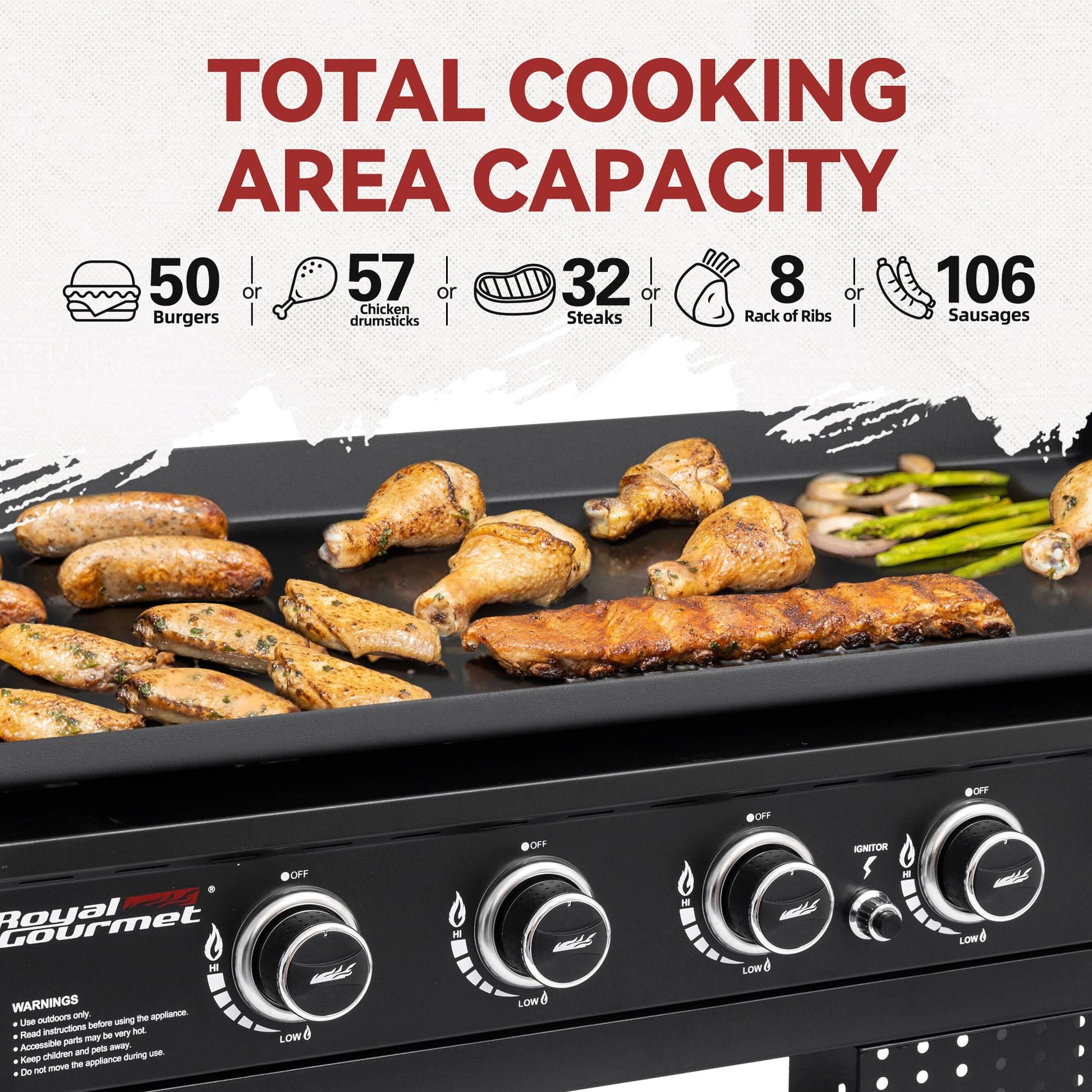 - Extra Large Cooking Surface: An overall 994 sq. in. cooking surface holds up to 50 burgers at once, serving 9-10 people. Large cooking space and six independently controlled burners allow you to cook various foods simultaneously