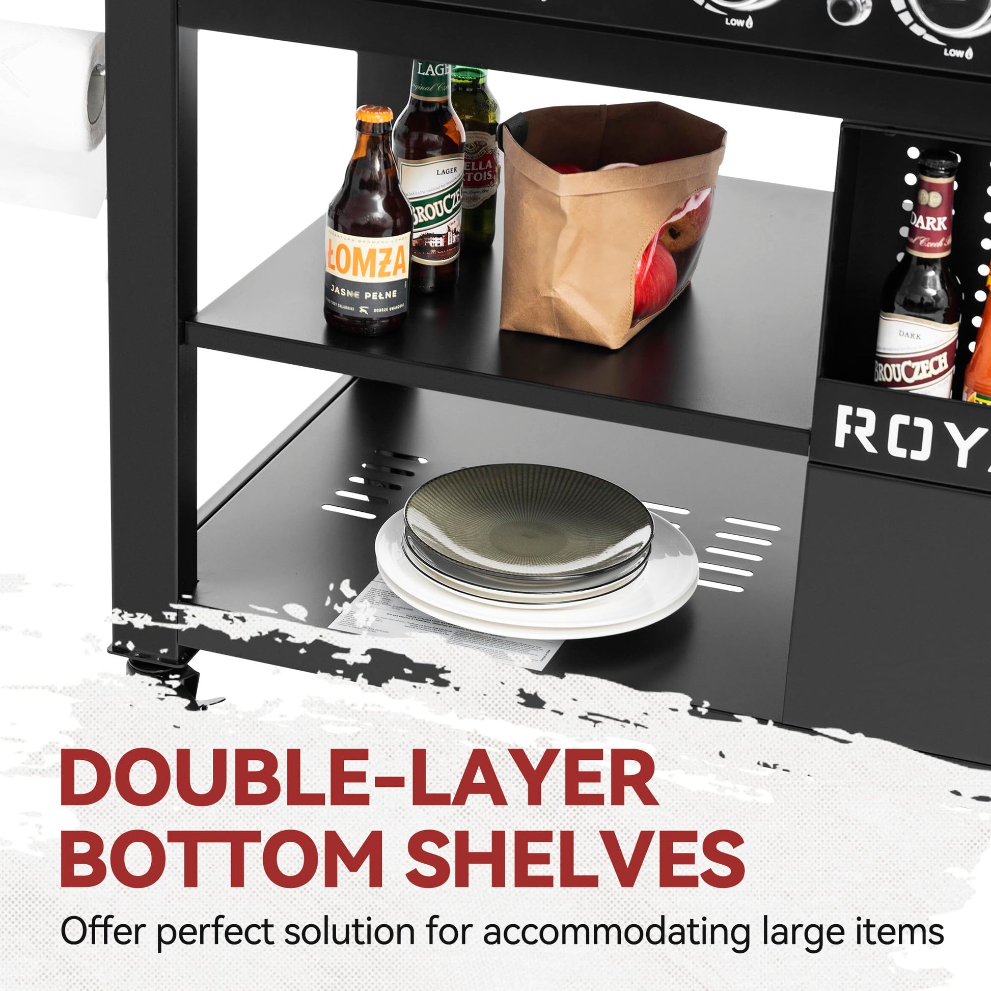 - Upgraded Storage Cart: Our upgraded storage cart features plenty of storage space where you can organize grill essentials orderly and eliminate mess: double-layer shelves on the left, front spice rack on the right, a cylinder base behind the rack