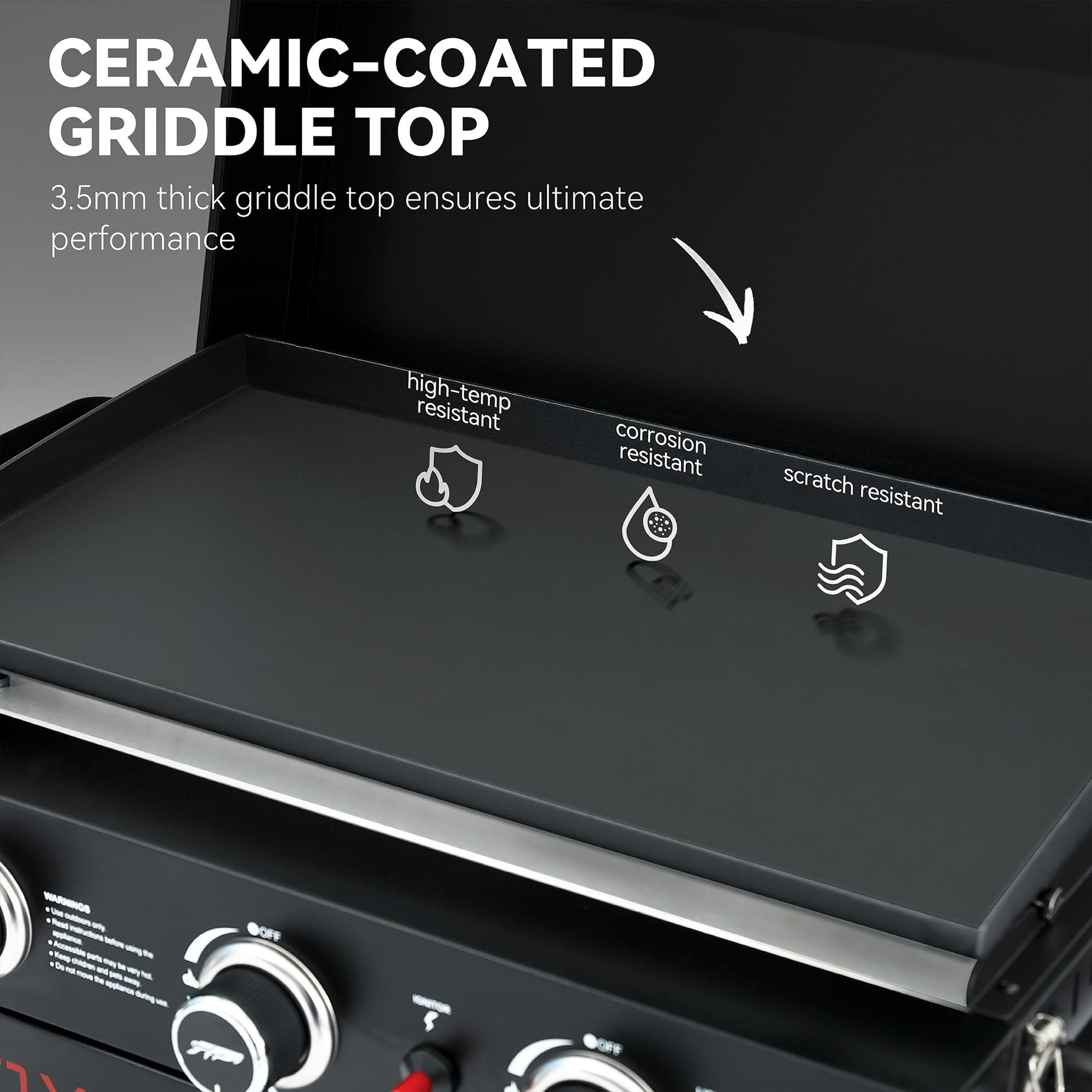 - Ceramic-coated Griddle Top: Engineered with state-of-the-art technology, our ceramic-coated griddle top boasts better high-temperature resistance, corrosion resistance, and scratch resistance. Note that the griddle top should be seasoned before use