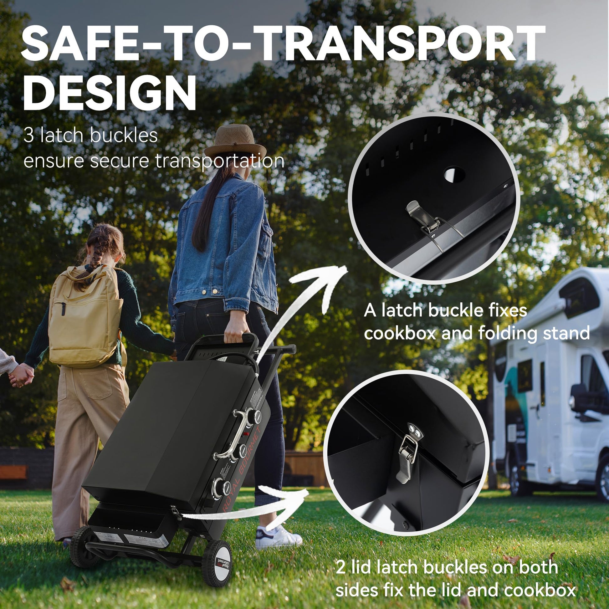 - Safety Features: The griddle top can pass FDA and PFAS testing for safer and healthier cooking. During transportation of this griddle, two lid latch buckles ensure firm closure for enhanced security, avoiding the risk of accidentally popping open