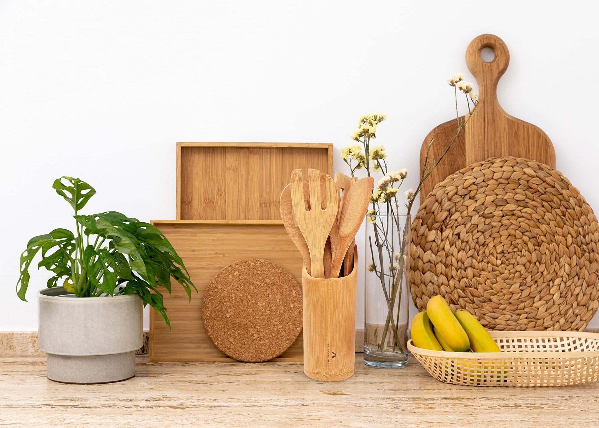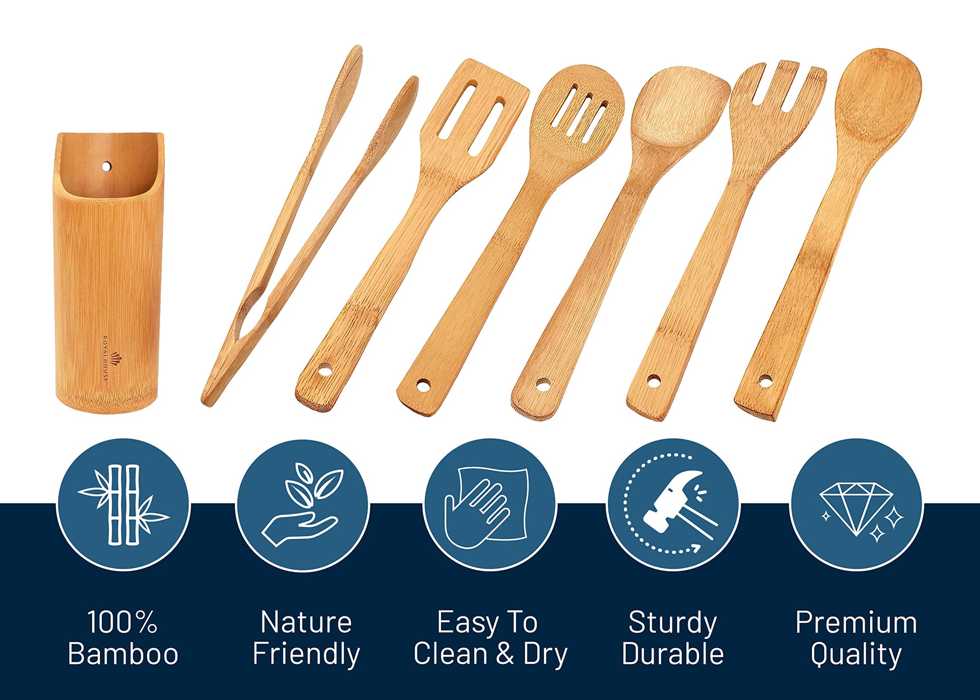 - 7 Pieces: This utensil set has 7 pieces, 5 spoons and spatulas, cooking tongs, and the utensil holder that fulfilled every one of your requirements for your cooking and baking, solid and lovely bamboo kitchen tools.
