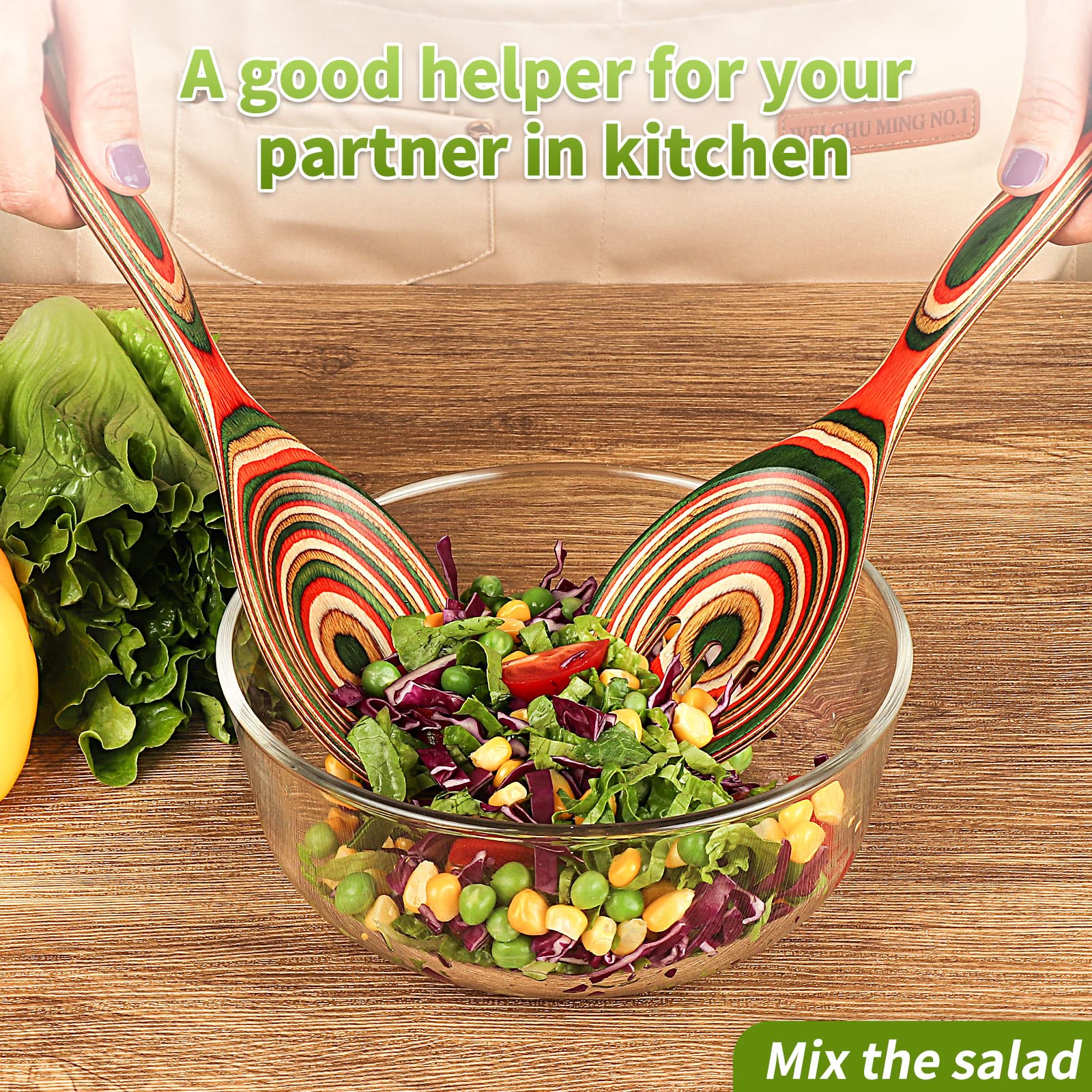 - 【VERSATILE USAGE】Our wooden salad servers are appropriate for tossing and serving salad, fruits, pasta or vegetables. Safe to use wooden tongs on nonstick cookware and other delicate finishes to add a twist to your kitchenware utensils.