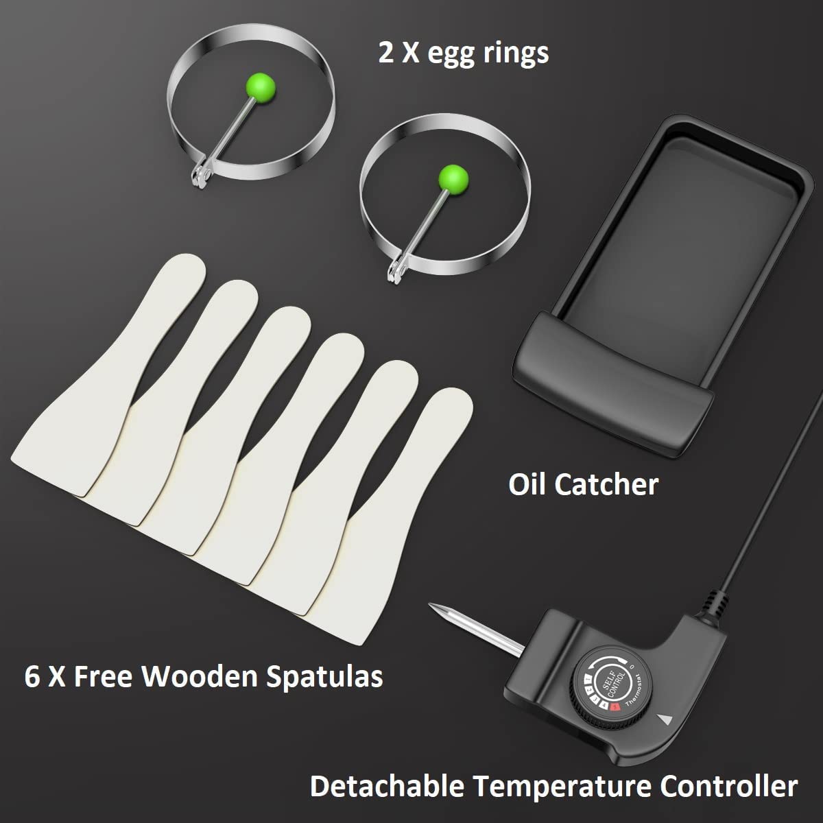 - 🥩PERFECT INDOOR BBQ PARTY----Enjoy a barbecue with your family. 36x9 inch indoor griddle allows you to bake a variety of foods at once. Electric grill with 6 wooden spatulas and 2 non-stick egg rings, so you and friends can fully enjoy cooking fun. Smoke-free grill is perfect for parties, family dinner, indoor barbecues, camping, RVS and commercial use.