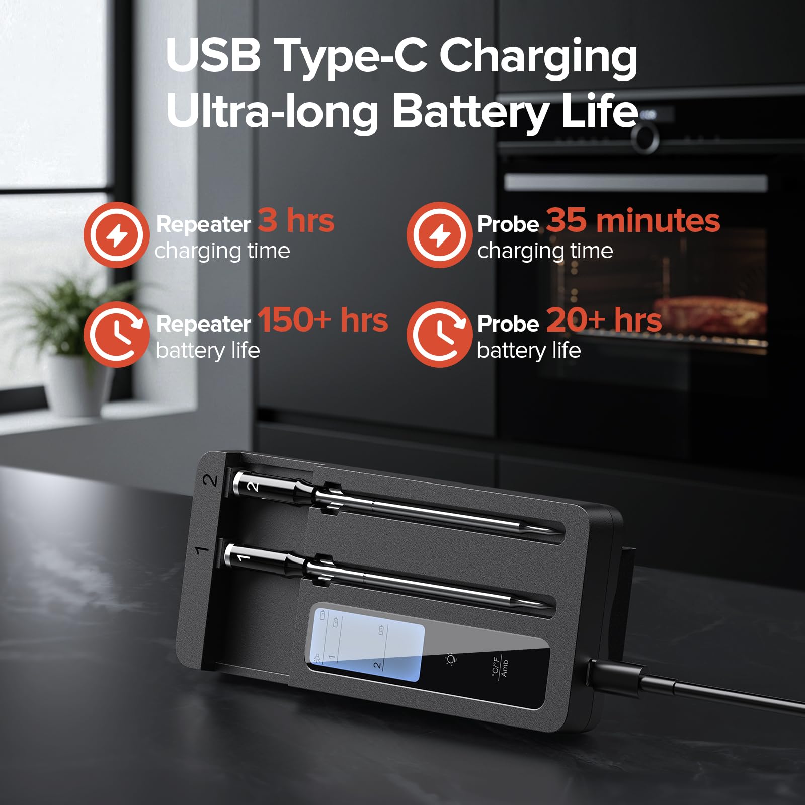 - Dual Ultra-Thin Probes:Monitors two dishes simultaneously while preserving protein integrity and juices through ultra-thin probe design for perfectly cooked meat every time.
