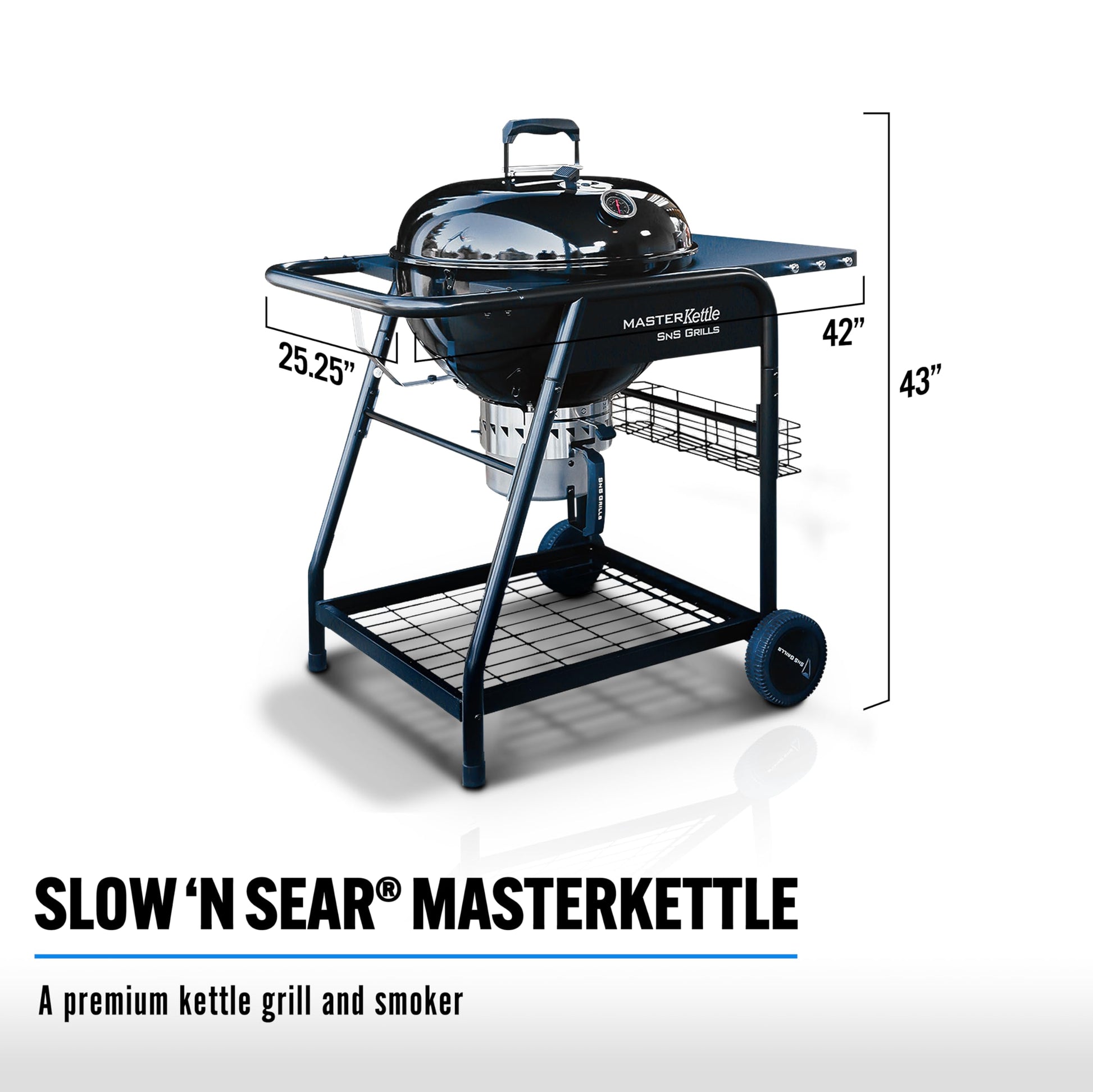 SnS Grills MasterKettle Charcoal Grill and Smoker with Patented Slow ‘N Sear Deluxe Insert, EasySpin Grate for Two-Zone Cooking and Integrated Table, Low ‘N Slow Smoking and BBQing - Black 22-Inch