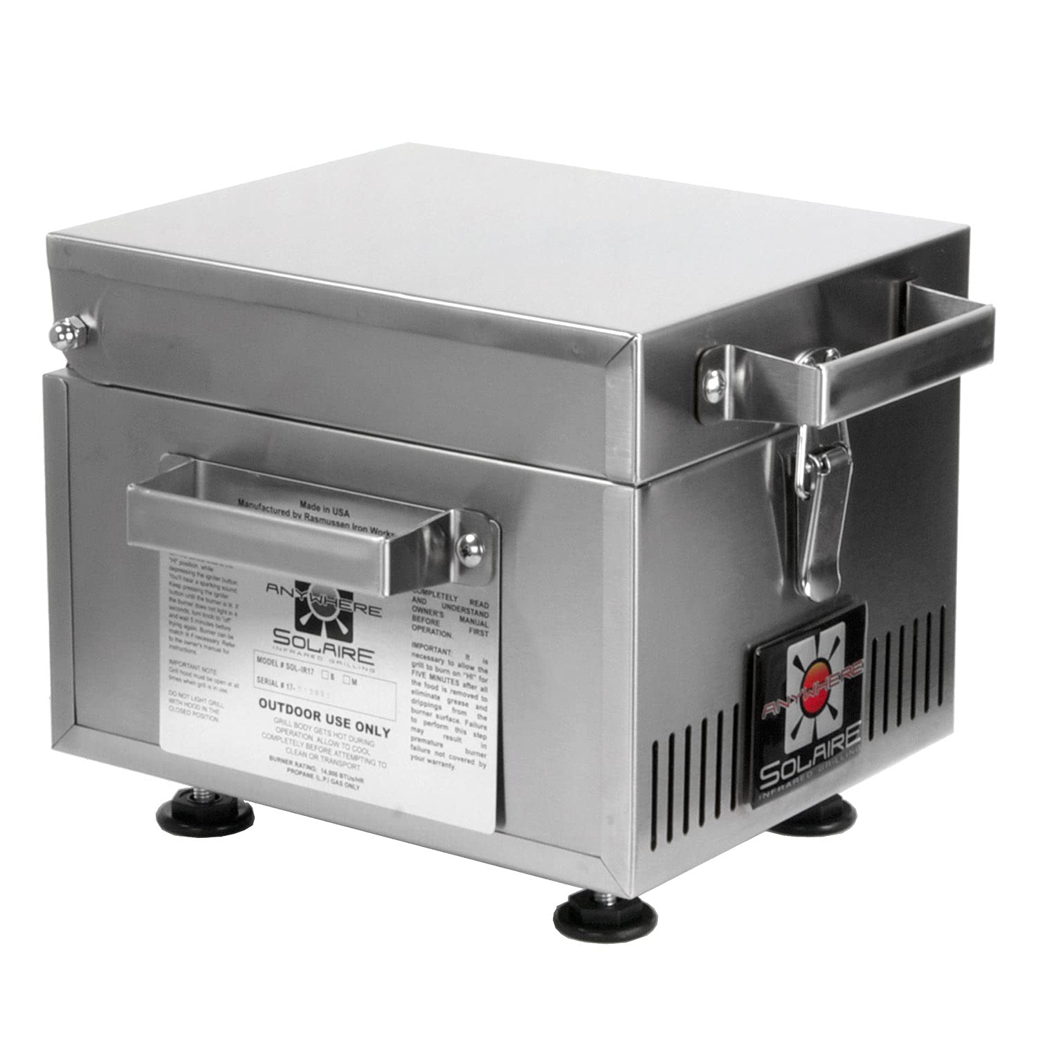 Details: The Solaire anywhere mini is a personal infrared grill. BE the envy of your co-workers - dine on filet mignon while they brown bag a baloney sandwich. Grilling area is big enough for two 4-Inch diameter burgers or filet migons, or one rib eye steak or chicken Breast. it is perfect for tailgaters, picnics, RVs, camping, boating, balconies & backyards - anywhere you want great tasting, juicy grilled food. This use-made portable grill features the Solaire infrared burner, which heats up in just three Min to searing hot temperatures that lock in the juices. it also has the Solaire v-grate, which improves flavor & virtually eliminates flare-ups. The only assembly is to attach the handles (6 bolts) & the four adjustable', otherwise this fully welded all-type 304 stainless steel grill is ready to use out of the box. it operates out of the box on 1-Pound propane bottles (not included), & can be used with larger BBQ propane tanks with the adapter hose accessory (item #sol-sahose56). the hood, which protects the burner during transport & storage, has spring-loaded latches. The Solaire anywhere mini is a grilling Machine that gives you the great flavor of an intensely hot charcoal fire with the control, convenience & consistency of gas. Become the undisputed Wizard of the campsite, the envy of your parking lot, & the Hero of your family when you serve them juicier, more flavorful food then they've ever tasted from an ordinary grill.