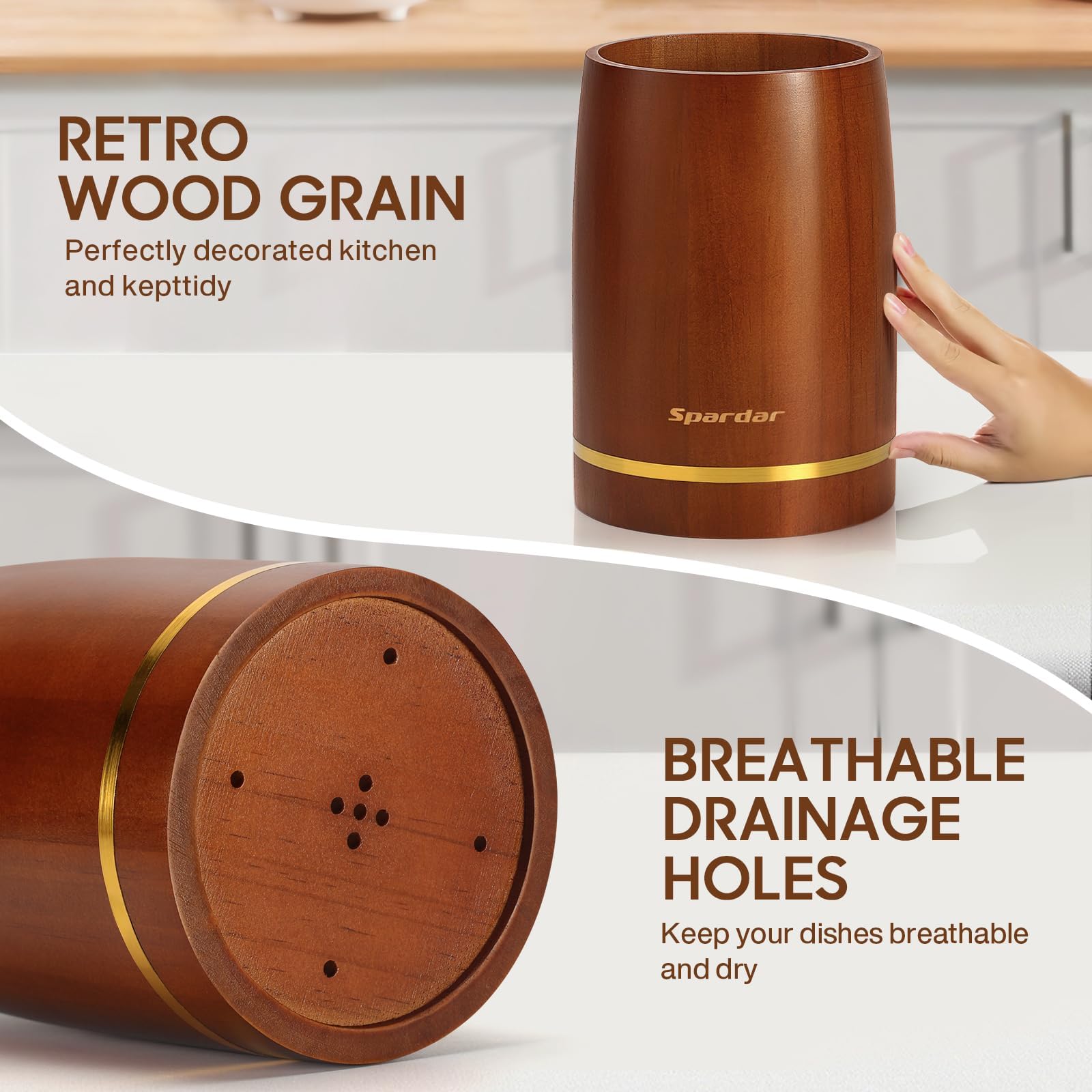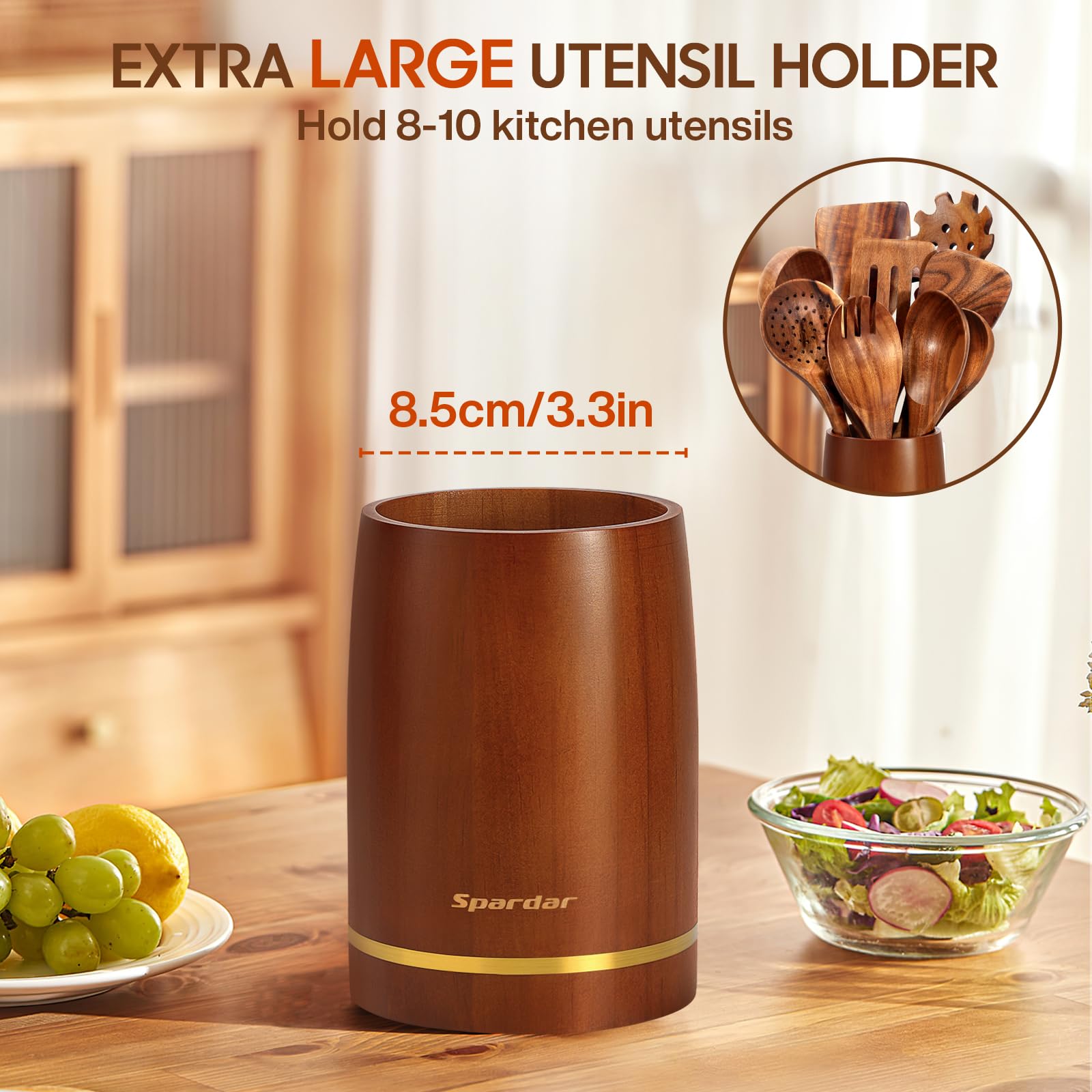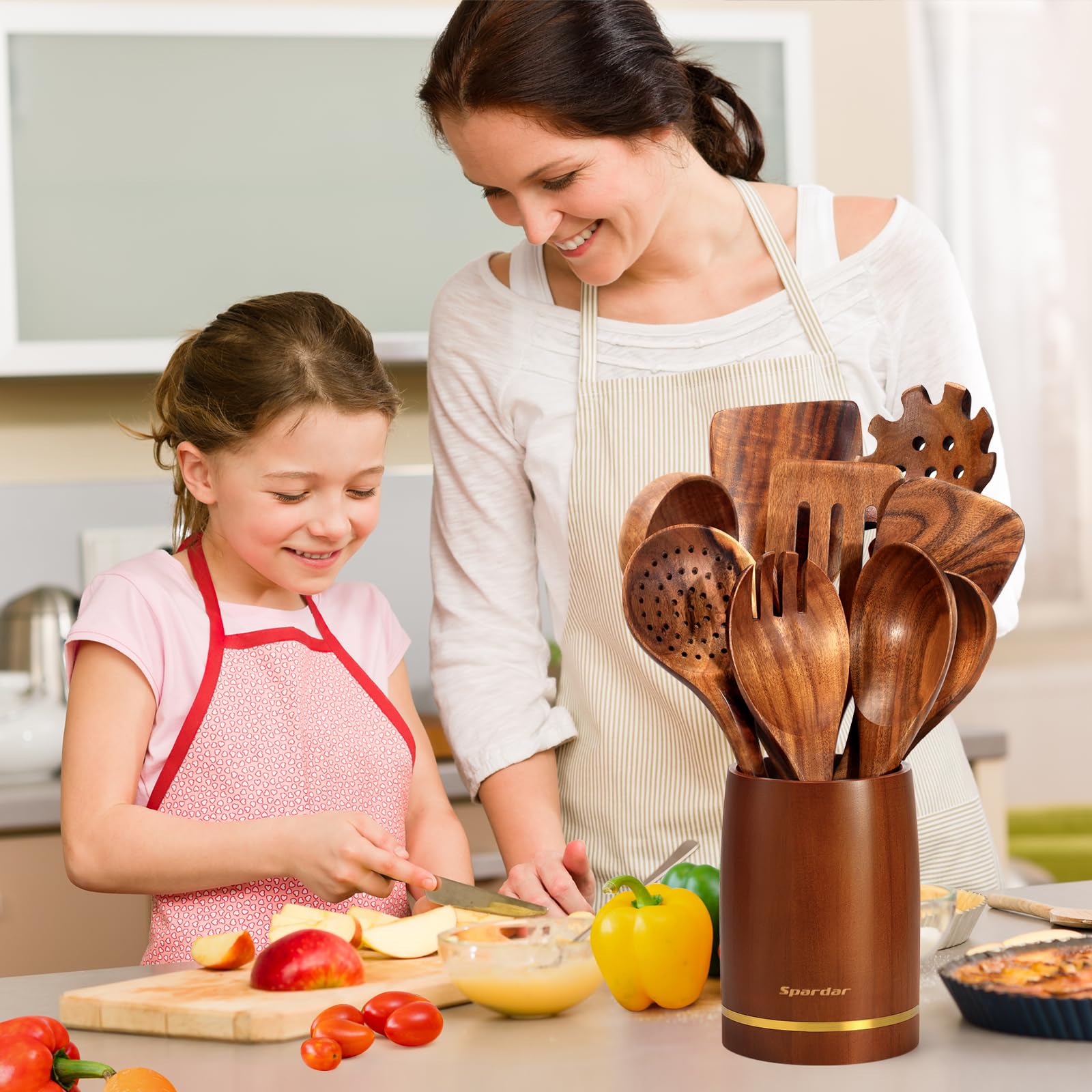Spardar Wooden Kitchen Utensils, 12 Piece Set Wooden Spoon Set with 9 Teak Wood Cooking Spoons, Spoon Rest, Pot Holde, 3.3 Inch Utensil Holder, as Kitchen Decoration and Housewarming Gift