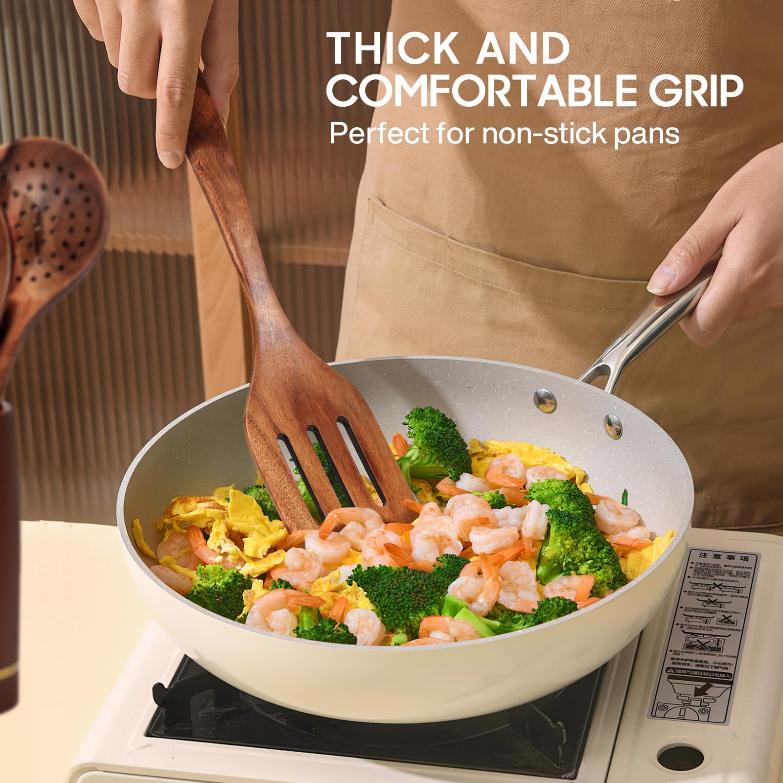 - 100% Teak: Our wooden kitchen utensils is made of 100% teak. Teak is highly resistant and will not deform, crack or corrode even in high temperature environments. Instead, it will become more beautiful over time. In addition, its delicate and beautiful texture not only allows you to enjoy the fun of cooking during use, but also provides a high-end decorative effect for your kitchen.