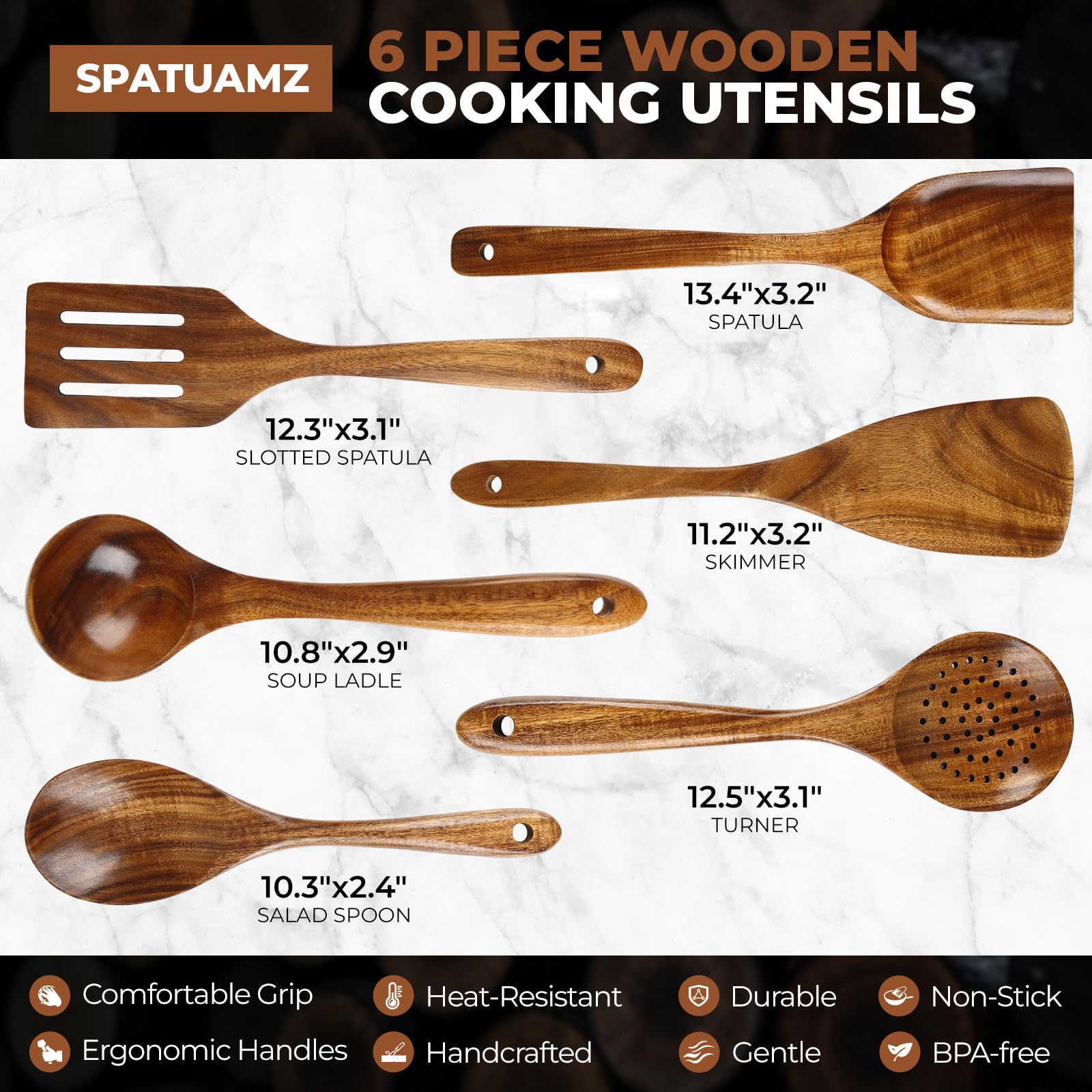 SPATUAMZ Wooden Cooking Spoons, Ladle and Spatula, Fine Polished Teak Wood Cooking Utensils Set of 6, Nonstick Wooden Kitchen Spoon & Spatula Set