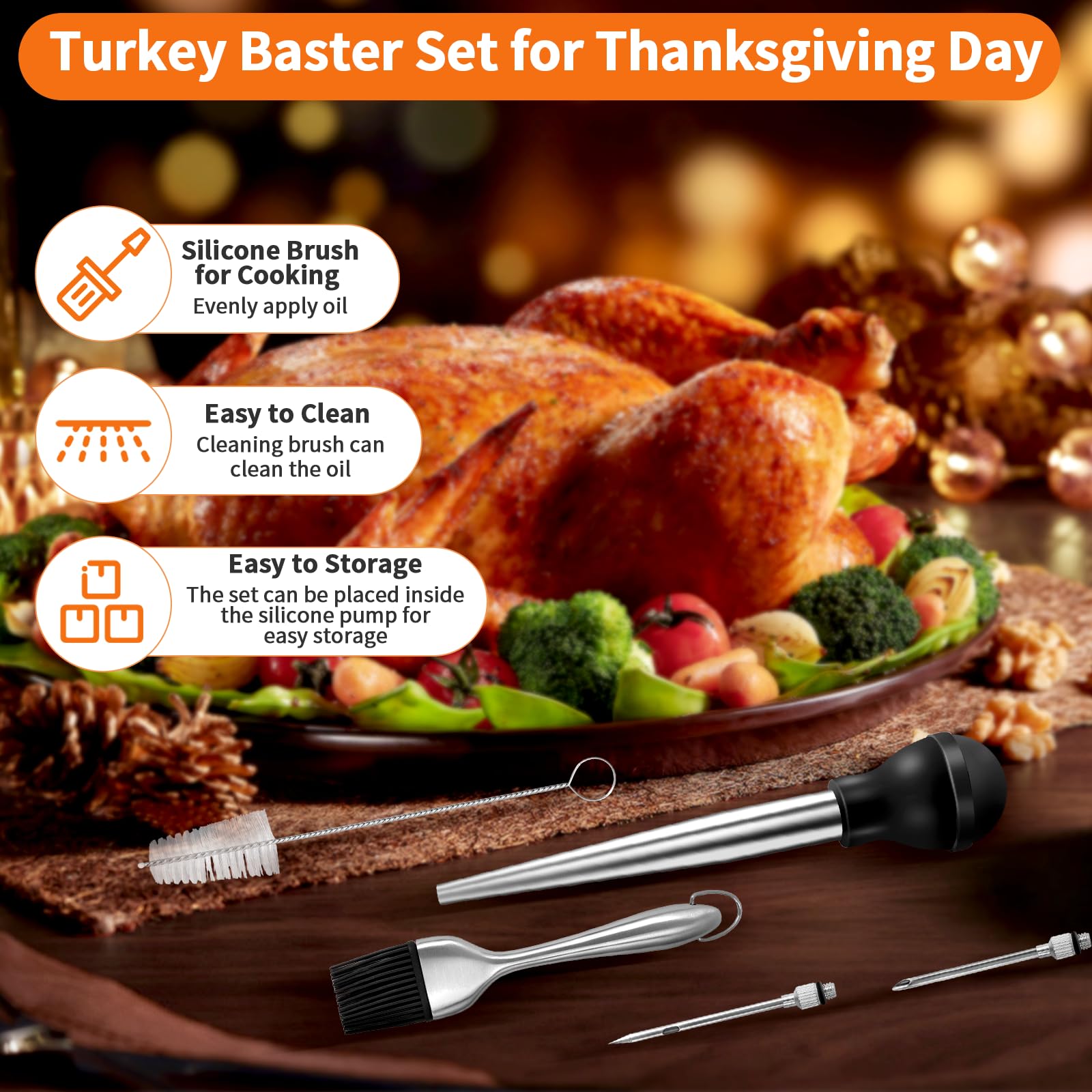 - 【Two Precision Needles for Maximum Versatility】Whether you're injecting thin marinades or chunky sauces, our metal turkey baster set includes two stainless steel needles that cater to every culinary need. From tenderizing meat to infusing bold flavors, the turkey injector and baster perfect for everything from turkey to brisket, making meal prep easier and more precise