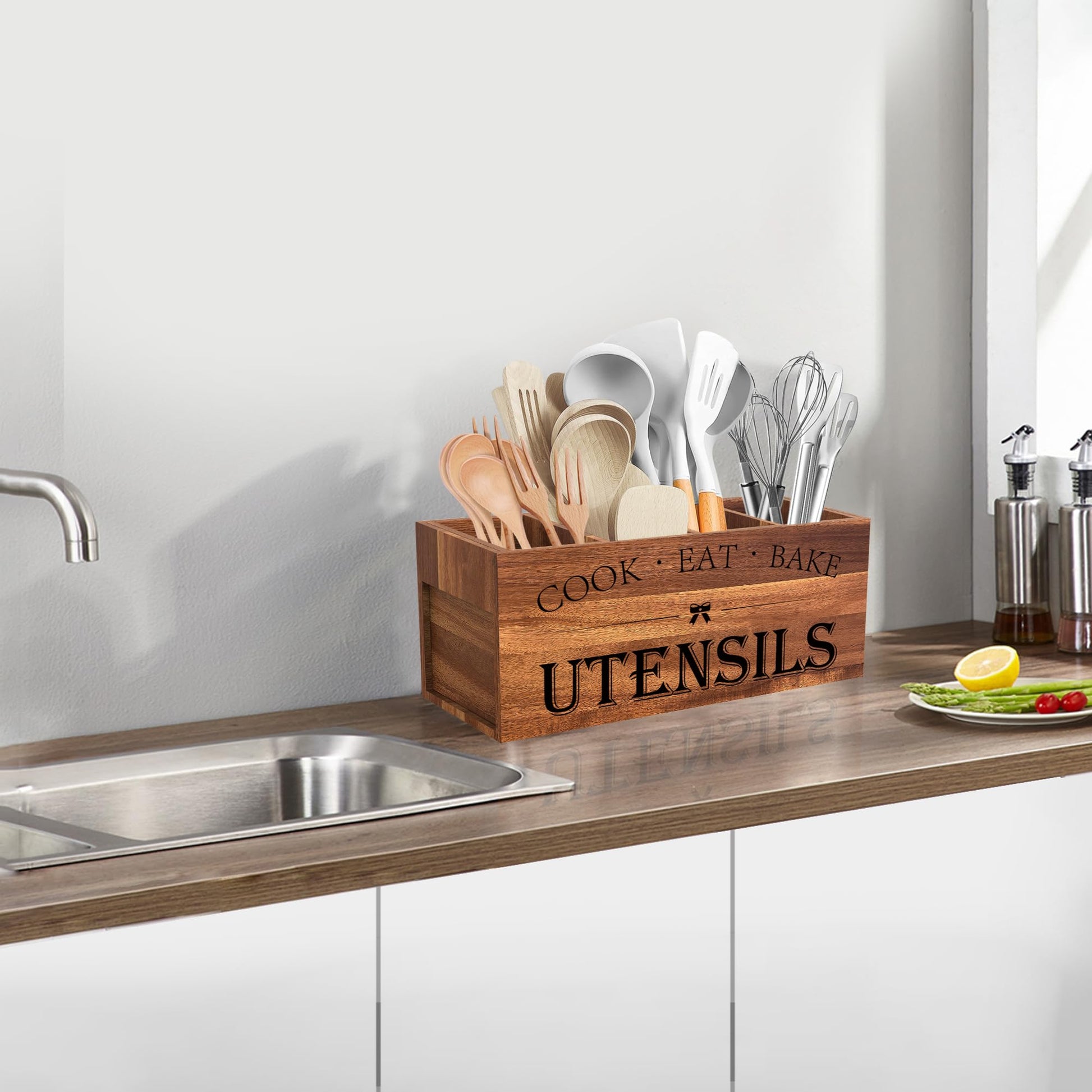 - UPGRADE DIVIDER DESIGN - Our acacia wooden utensil organizer has 4 compartments. Large, roomy and pretty. Easy to grab utensils. Size:15.74"L x 5.9"W x 7.08"H. You can store all of your cooking tools easily and neatly. The rectangular shape can fit in nicely against the wall. A nice kitchen decoration!