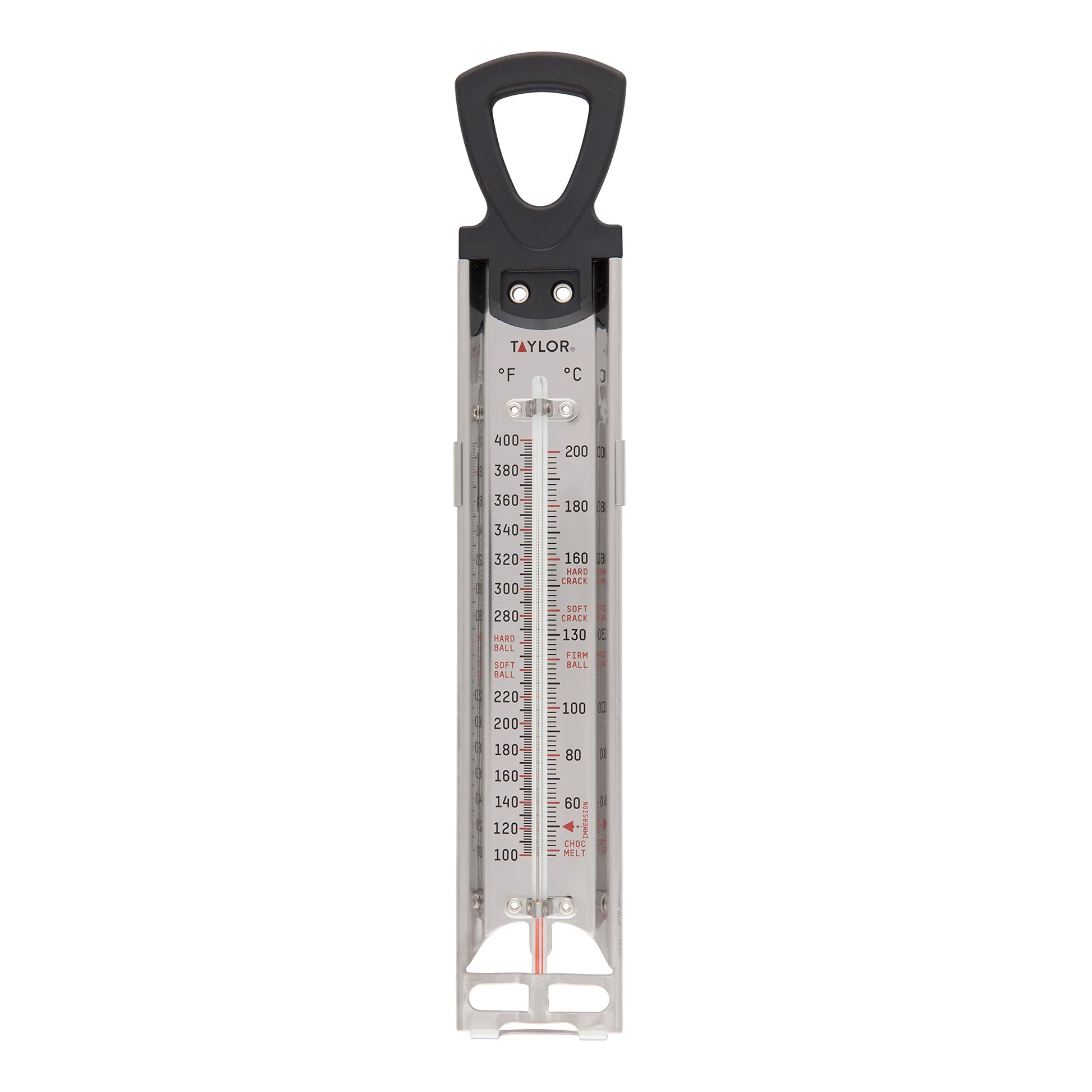 The Taylor Candy & Deep Fry Stainless Steel Paddle Thermometer is easy to use and provides superior results for professional and amateur cooks alike The adjustable clip secures the thermometer to almost any cooking pan for safety and stability during use Markings on the thermometer's face shows the range of proper candy temperatures from thread to hard-crack The thermometer measures 12-inches in length and has a magnified display for easy temperature readings It is made of durable food-grade stainless steel with a heat resistant nylon handle It's perfect for candy fudge fried chicken and even crafts like candle or soap making. ;This high-temperature thermometer takes the guesswork out of deep-frying chicken, doughnuts, and french fries or making jelly, fudge, or butterscotch. Its easy-to-read 8-inch face measures temperatures from 100 to 400 degrees F. The face shows proper candy-making temperatures, from "thread" to "hard crack." An adjustable clip on the insulated handle secures the thermometer to a pan. Made of stainless steel with a shatterproof plastic lens, the thermometer measures 12 inches long overall and is dishwasher-safe. --Fred Brack.