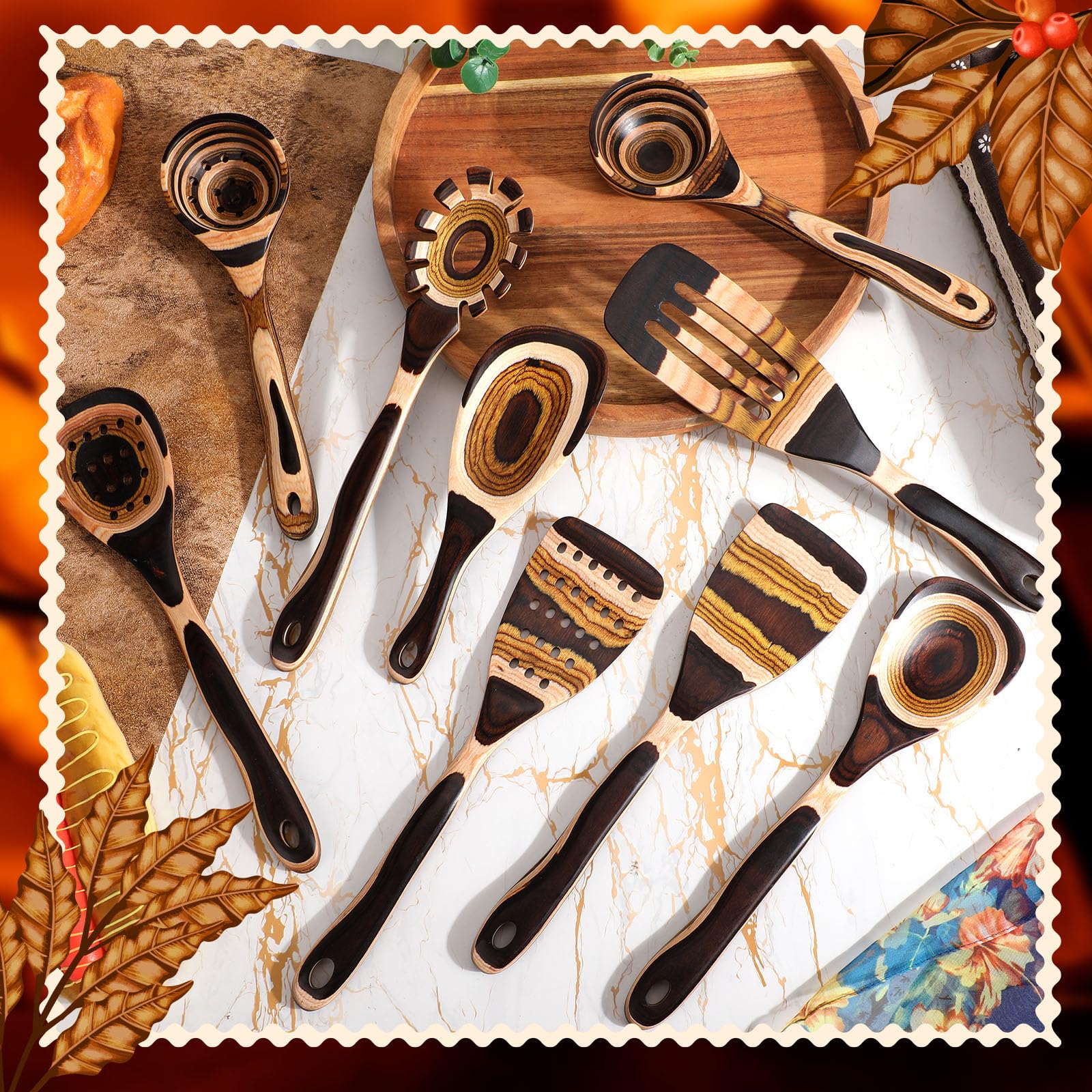 - Pakkawood Kitchenware Set: you will receive 9 pieces of pakkawood wooden cooking utensils that includes 2 deep soup ladles(12inch in length), pasta spoon, rice spoon, frying spatula, stir frying spatula, slotted spoon, flat spatula, spatula, pizza spatula, complete and practical in variety, meet your kinds of cooking needs