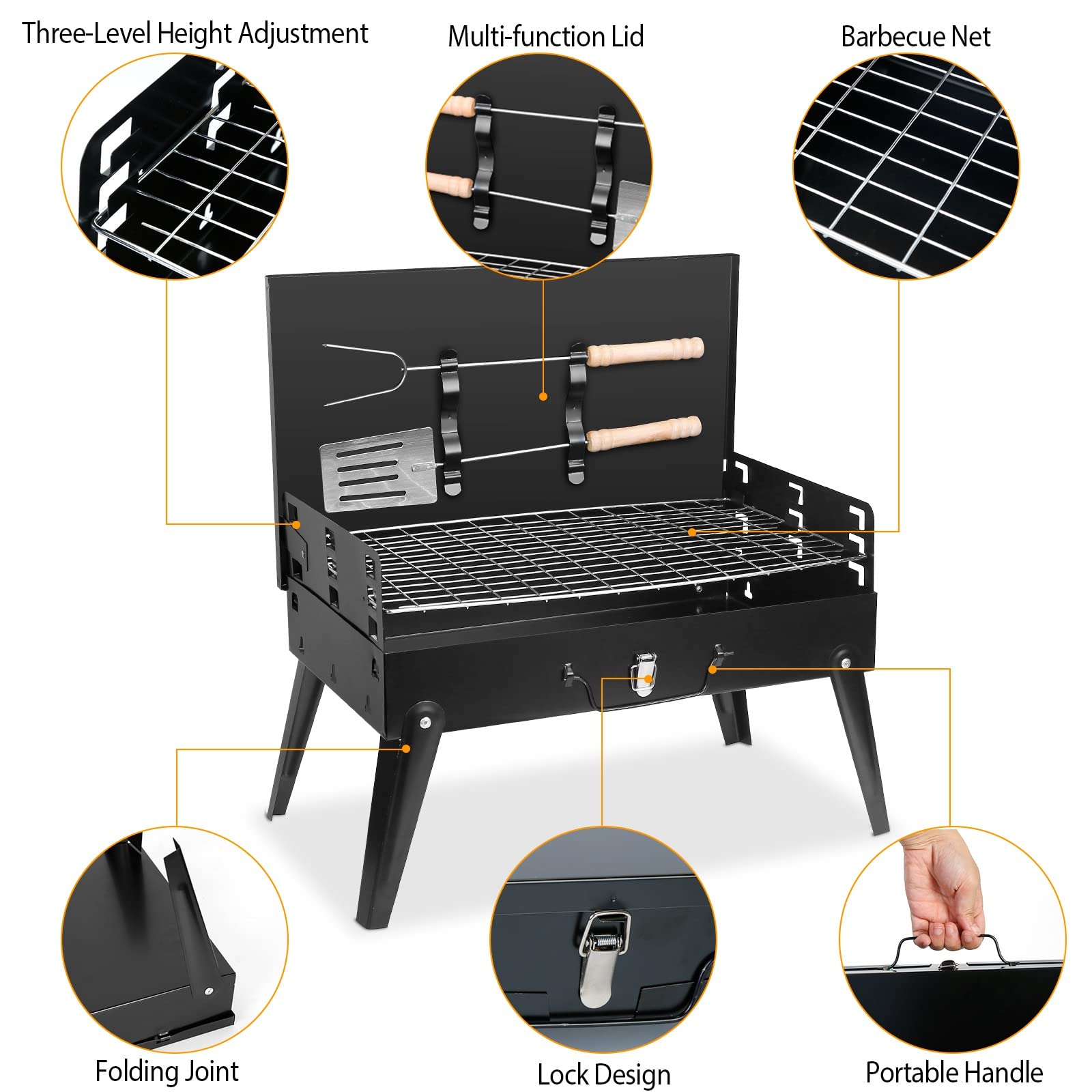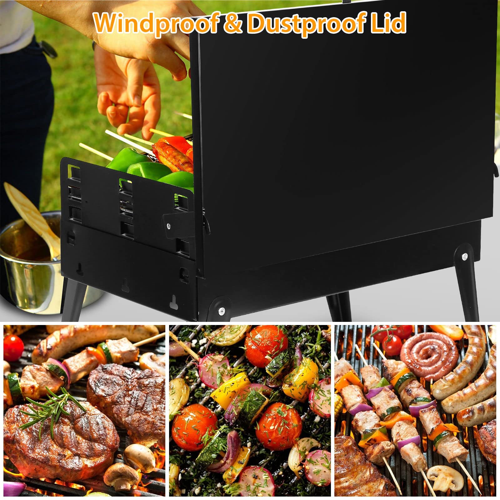 - 【2025 Upgraded Charcoal Grills with Lid】The multifunctional cover of the portable charcoal grill can not only be used to block the wind and dust when it is open, don't have to worry about getting dirt in your food and stinging eyes from smoke, but the cover with a buckle design can also be used to fix barbecue tools, such as forks and spades, which is very convenient.