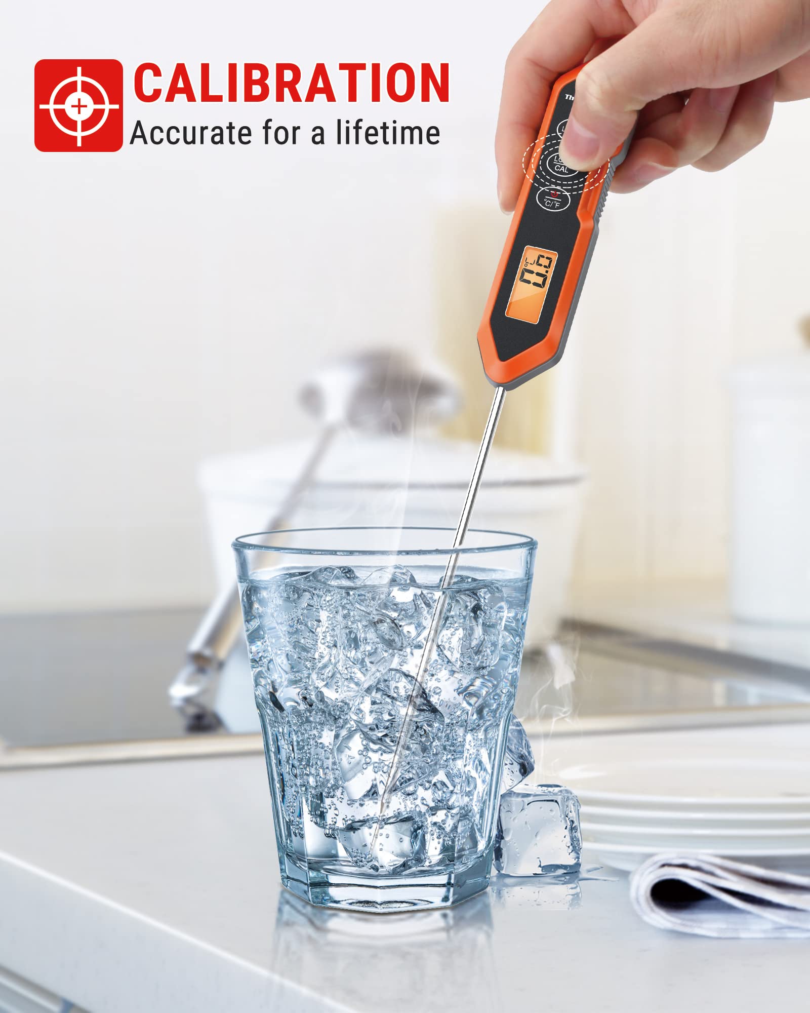 - Lock & Calibration Function: Kitchen thermometer lets you read temperatures safely away from heat by capturing temperatures on the display. The user calibration function extends product life