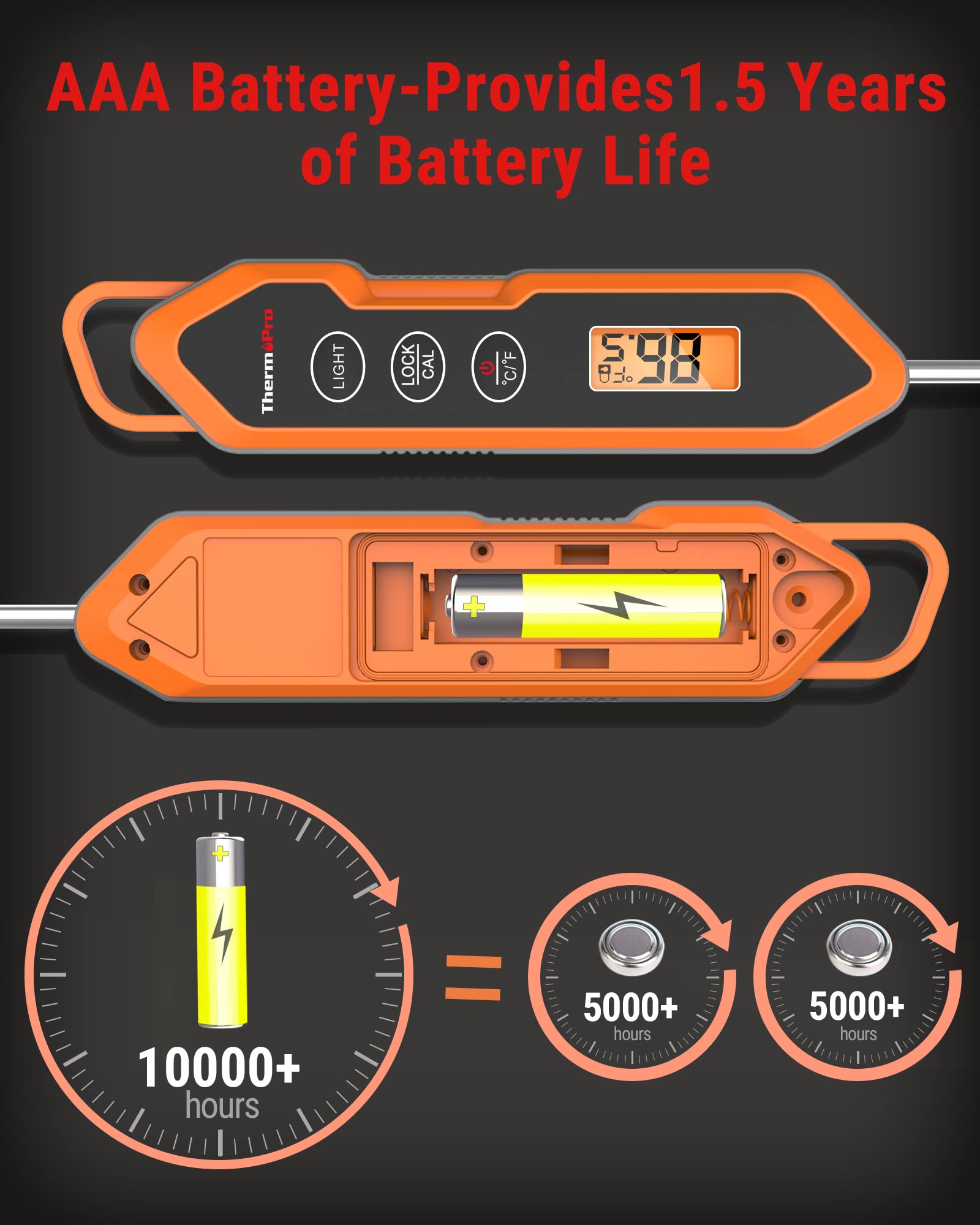 - Backlit, Crystal-Clear LCD Display: BBQ thermometer for grill has a backlight to allow viewing of temps even at night. AAA battery uses battery-saving technology to provide 3,000 hours of battery life