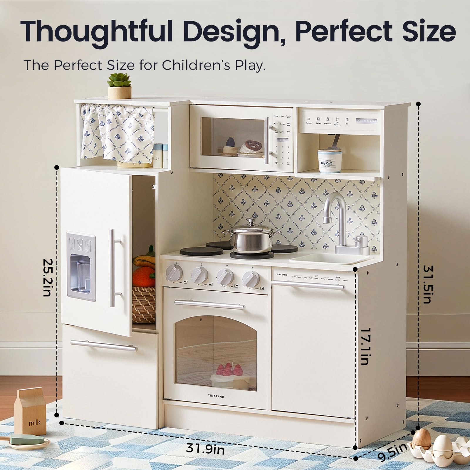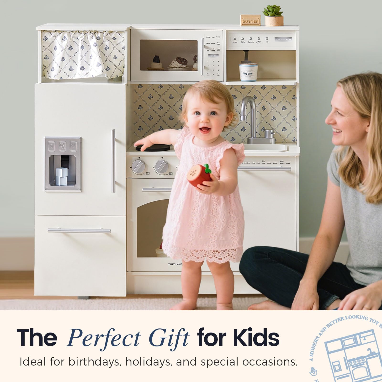 Tiny Land Play Kitchen for Kids, Upgraded Wooden Kitchen Toy with Complete Play Areas, Pretend Cooking Set with Sink, Stove, Microwave, Toy Coffee Station & Storage for Kids Ages 3+