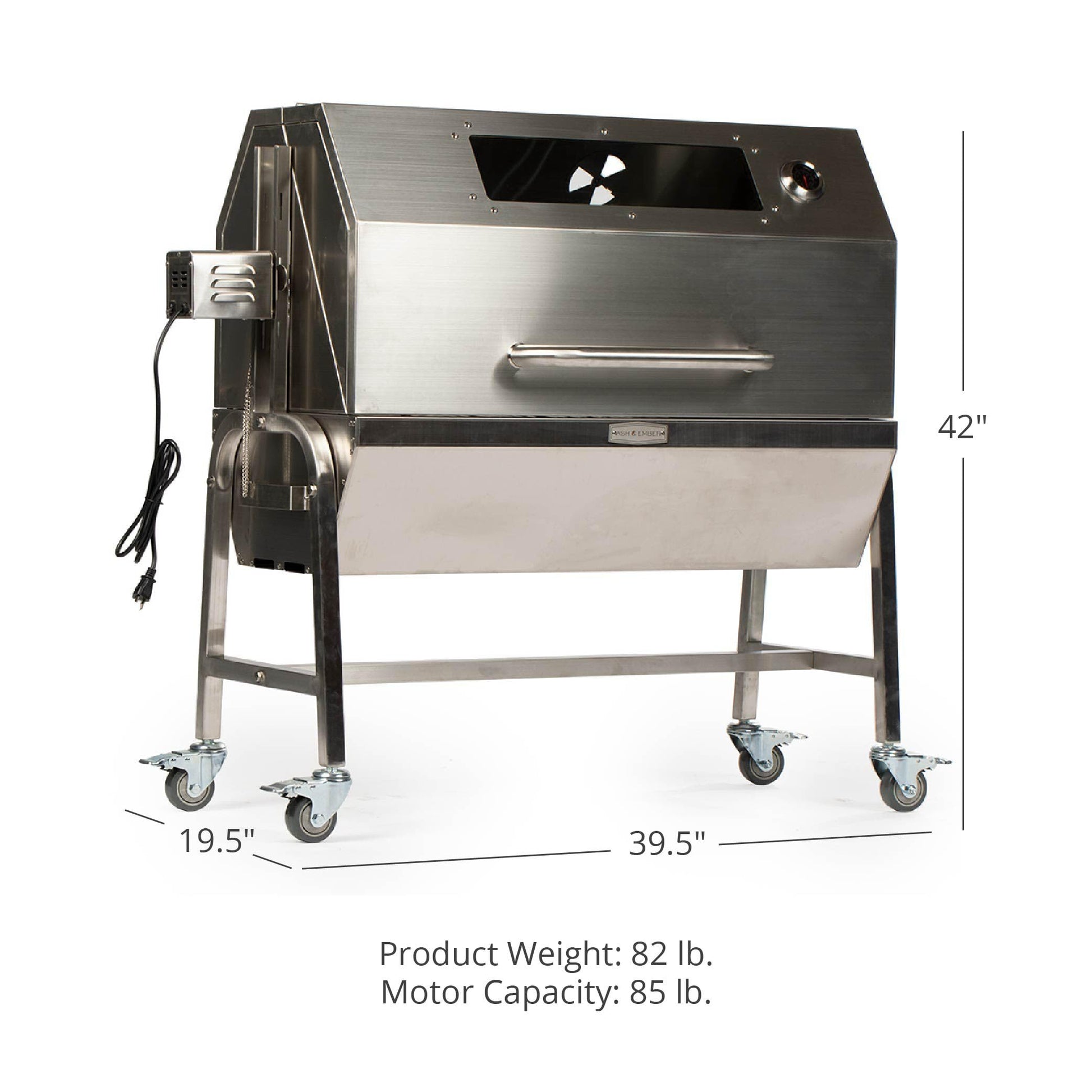 - DIMENSIONS: The roaster weighs 131-pounds and has an overall height of 33-inches, length of 45.5-inches, and a width of 24-inches. The roaster comes equipped with a 36.5 by 10.625-inch drip pan to catch the drained fat. Additionally, the implement comes with a hood and (4) easy-to-move swivel locking caster wheels.