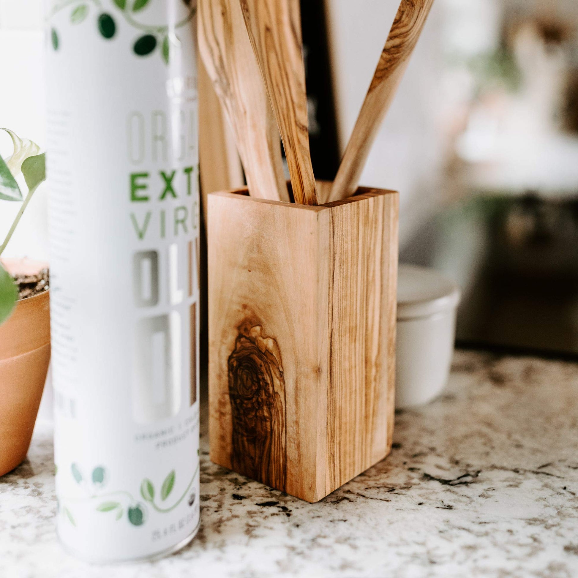 Tramanto Olive Wood Utensil Holder - Compact 3 x 3 Inch Square Wooden Crock for Kitchen Tools and Cooking (6 Inch Tall)