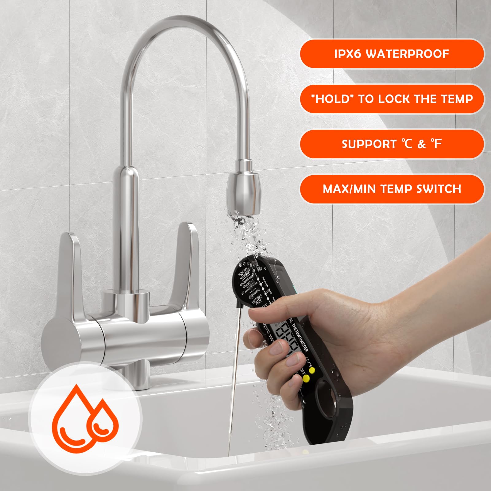 - 【Waterproof & Durable Design】Designed for busy kitchens and outdoor grilling, our food thermometer features an IPX6 waterproof rating for easy cleaning under running water. Built with food-grade 304 stainless steel and durable ABS plastic, it’s drop-resistant and built to last