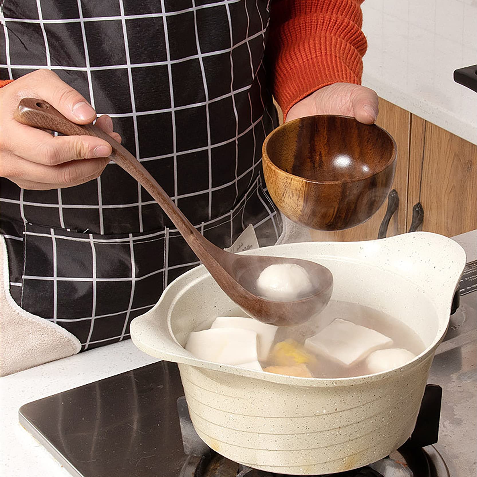 - Strong and wide handle won't fracture when mixing food, our high-end wooden cooking spatula set are suitable for cooking seafood soup, vegetable soup, japanese ramen, and stirring sauce, curry, etc. suit for non stick cookware.