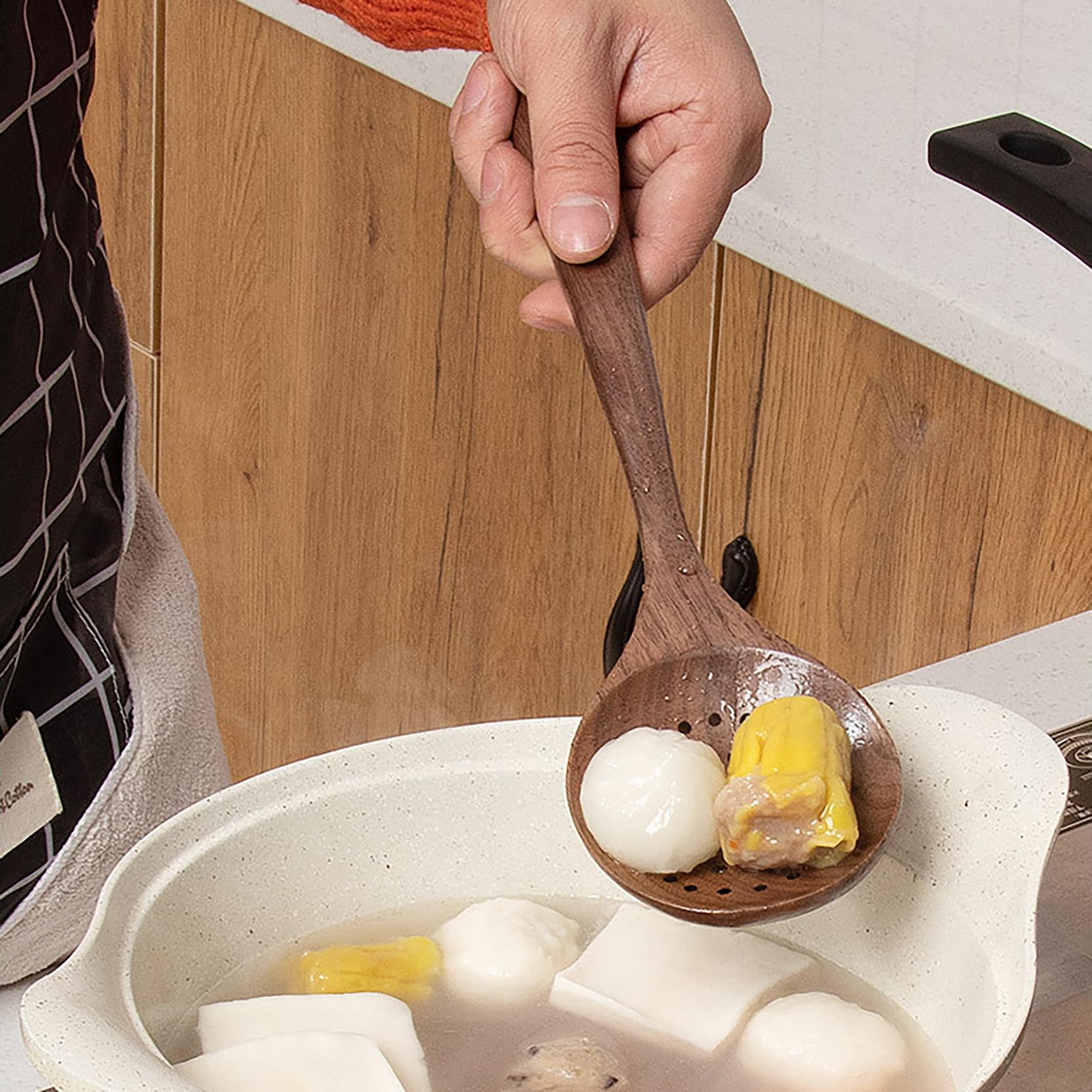 - Thickened handle of our wooden cooking utensils makes the grip more comfortable and powerful when stirring, and long handles have great heat insulation, protecting your hands from scalding. with hanging holes for easy storage. hand wash and air dry.