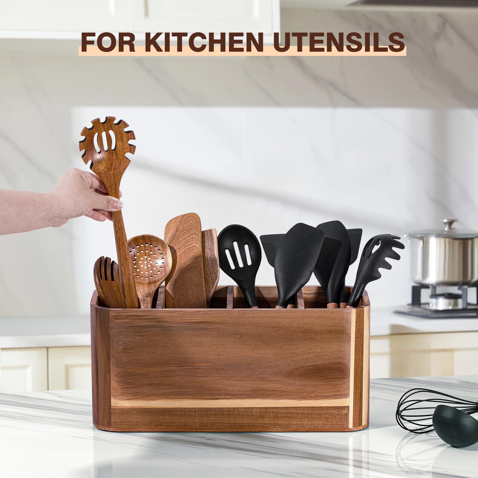 - [Farmhouse Kitchen Decor]: This Countertop Utensil Holder is Made of Acacia Wood, Solid wood Utensil Holder Matches all kitchen decor styles to add a pop of color to your kitchen.