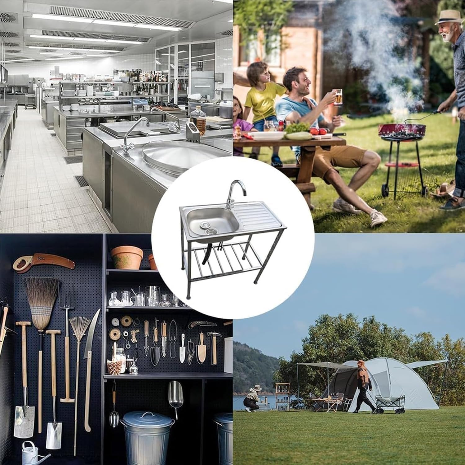- FREESTANDING INDUSTRIAL SINK - Large capacity deep bowl, more convenient to operate. Freestanding stand with workbench and bottom storage shelf highly improves the efficiency of kitchen work suitable for outdoor and indoor use.