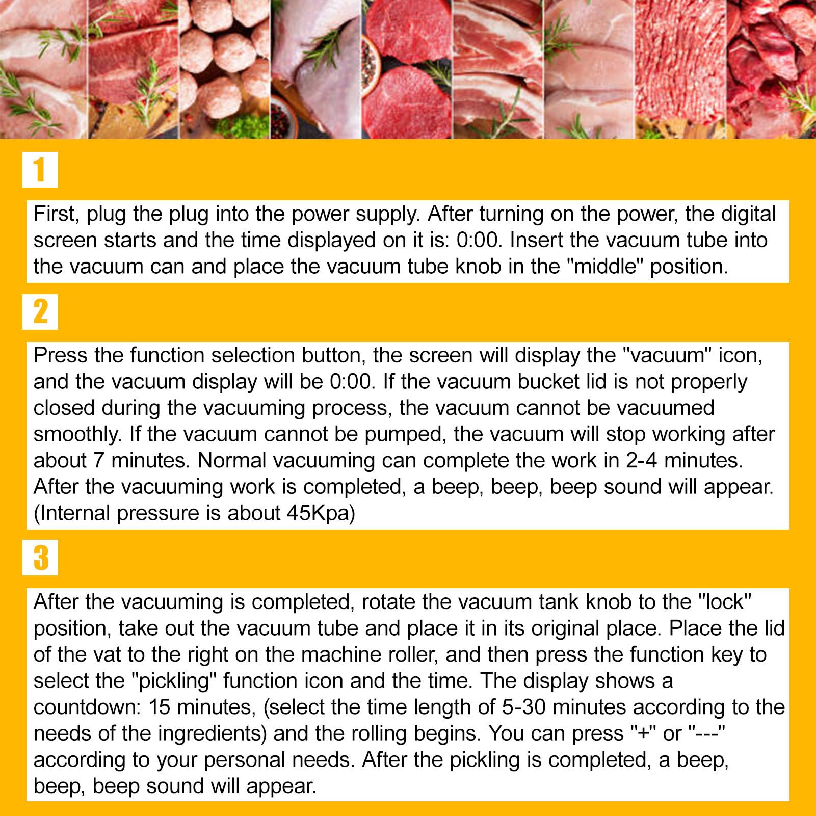 - When a vacuum is created inside the marinating drum, air gaps are created in the meat, fish, pork, etc., and the marinade rushes into these gaps to quickly enhance your favorite flavor.