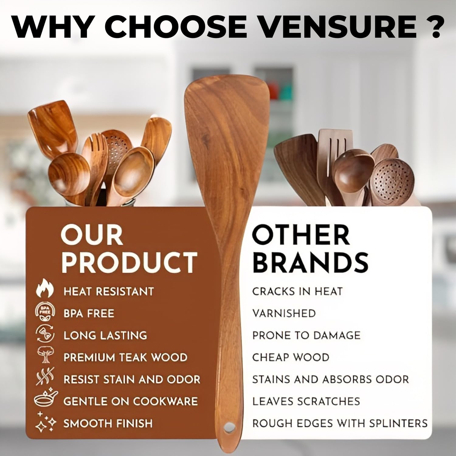 Vensure Wooden Spoons for Cooking 6 Pcs – Wooden Kitchen Utensils Set, Teak Wood Utensil Set – Comfortable Grip Non–Stick Wooden Cooking Utensil – Nonstick Natural and Healthy Kitchen Cookware