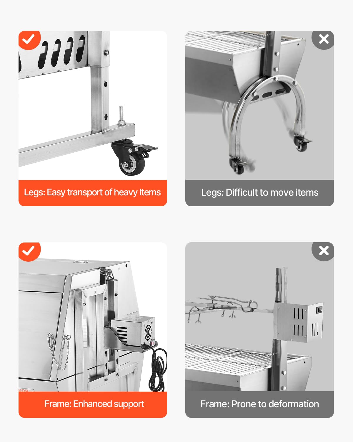 - User-Friendly Design: The stainless steel rotisserie roaster comes with 4 detachable and lockable wheels, making it easier to move and providing more stability while cooking. It includes a 56x13-inch large oil drip tray to prevent food grease from causing uncontrolled internal temperatures, maintaining the flavor of the roast.
